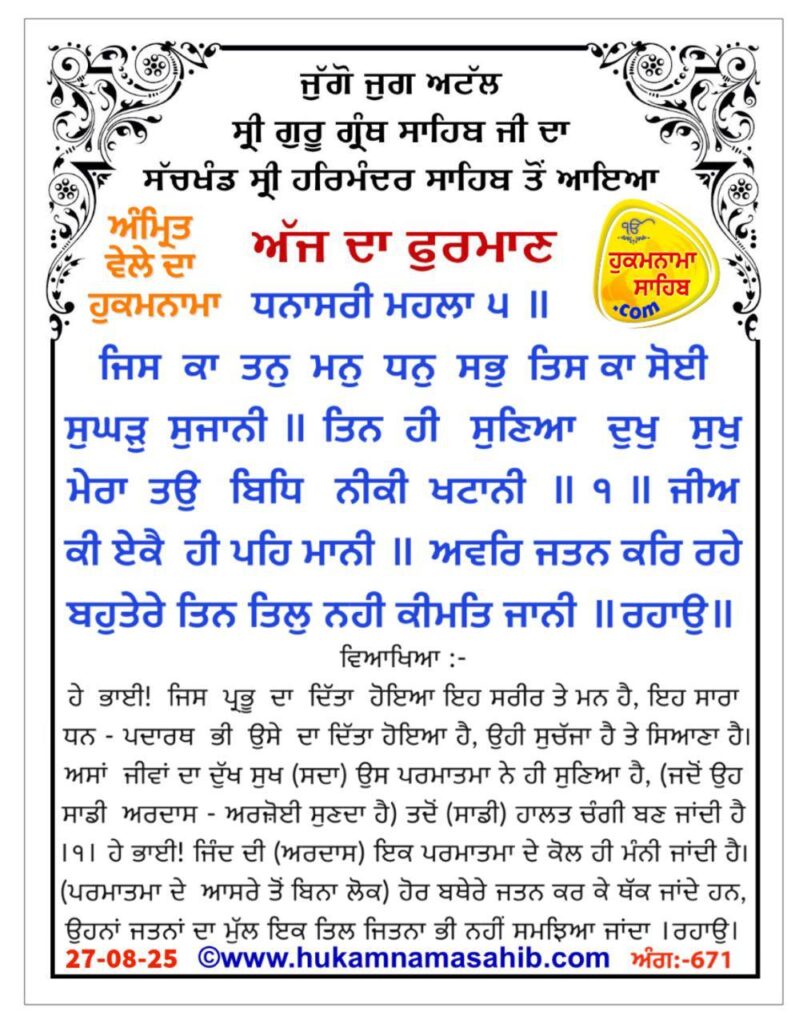 ਸੱਚਖੰਡ ਸ੍ਰੀ ਹਰਿਮੰਦਰ ਸਾਹਿਬ, ਸ੍ਰੀ ਅੰਮ੍ਰਿਤਸਰ, 27-08-2025