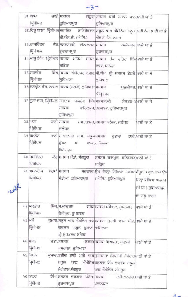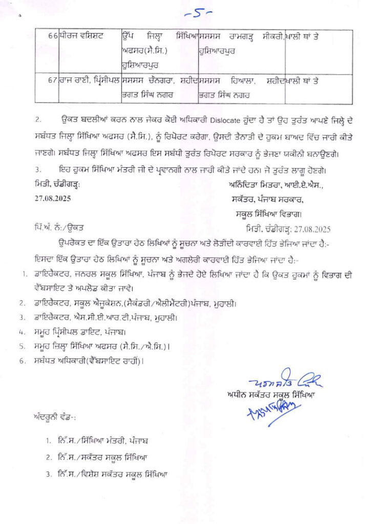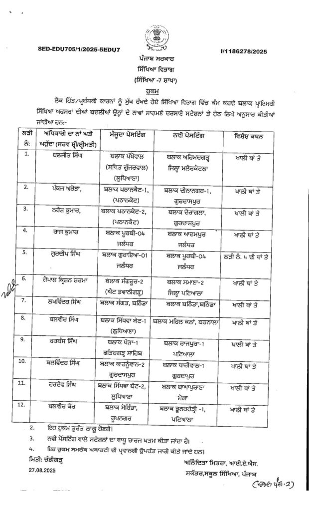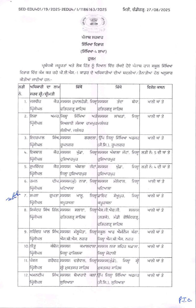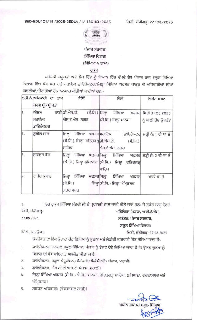 ਪੰਜਾਬ ਸਰਕਾਰ ਵੱਲੋਂ ਜ਼ਿਲ੍ਹਾ ਸਿੱਖਿਆ ਅਫ਼ਸਰਾਂ, BEPO ਅਤੇ ਪ੍ਰਿੰਸੀਪਲਾਂ ਦੀਆਂ ਬਦਲੀਆਂ ਪੰਜਾਬ ਅਗਸਤ 27, 2025ਅਗਸਤ 27, 2025Leave a Comment on ਪੰਜਾਬ ਸਰਕਾਰ ਵੱਲੋਂ ਜ਼ਿਲ੍ਹਾ ਸਿੱਖਿਆ ਅਫ਼ਸਰਾਂ, BEPO ਅਤੇ ਪ੍ਰਿੰਸੀਪਲਾਂ ਦੀਆਂ ਬਦਲੀਆਂ ਚੰਡੀਗੜ੍ਹ, 27 ਅਗਸਤ, ਦੇਸ਼ ਕਲਿੱਕ ਬਿਓਰੋ : ਪੰਜਾਬ ਸਰਕਾਰ ਵੱਲੋਂ ਸਿੱਖਿਆ ਵਿਭਾਗ ਵਿੱਚ ਵੱਡੇ ਪੱਧਰ ਉਤੇ ਤਬਦਲੇ ਕੀਤੇ ਗਏ ਹਨ। ਸਿੱਖਿਆ ਵਿਭਾਗ ਵਿੱਚ ਜ਼ਿਲ੍ਹਾ ਸਿੱਖਿਆ ਅਫ਼ਸਰ, ਬਲਾਕ ਪ੍ਰਾਇਮਰੀ ਸਿੱਖਿਆ ਅਫ਼ਸਰ ਅਤੇ ਪ੍ਰਿੰਸੀਪਲਾਂ ਦੀਆਂ ਬਦਲੀਆਂ ਕੀਤੀਆਂ ਗਈਆਂ ਹਨ।