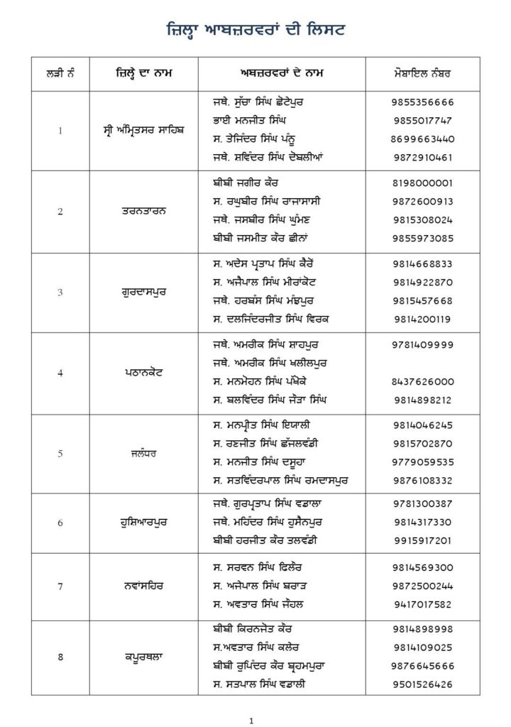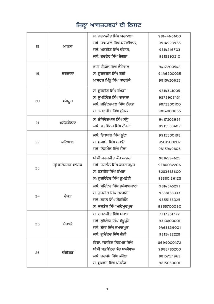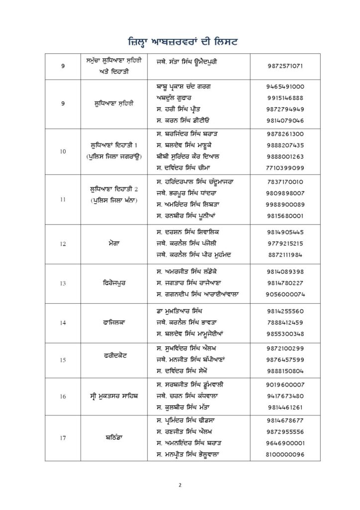 ਜ਼ਿਲ੍ਹਾ ਆਬਜ਼ਰਵਰਾਂ ਦਾ ਐਲਾਨ