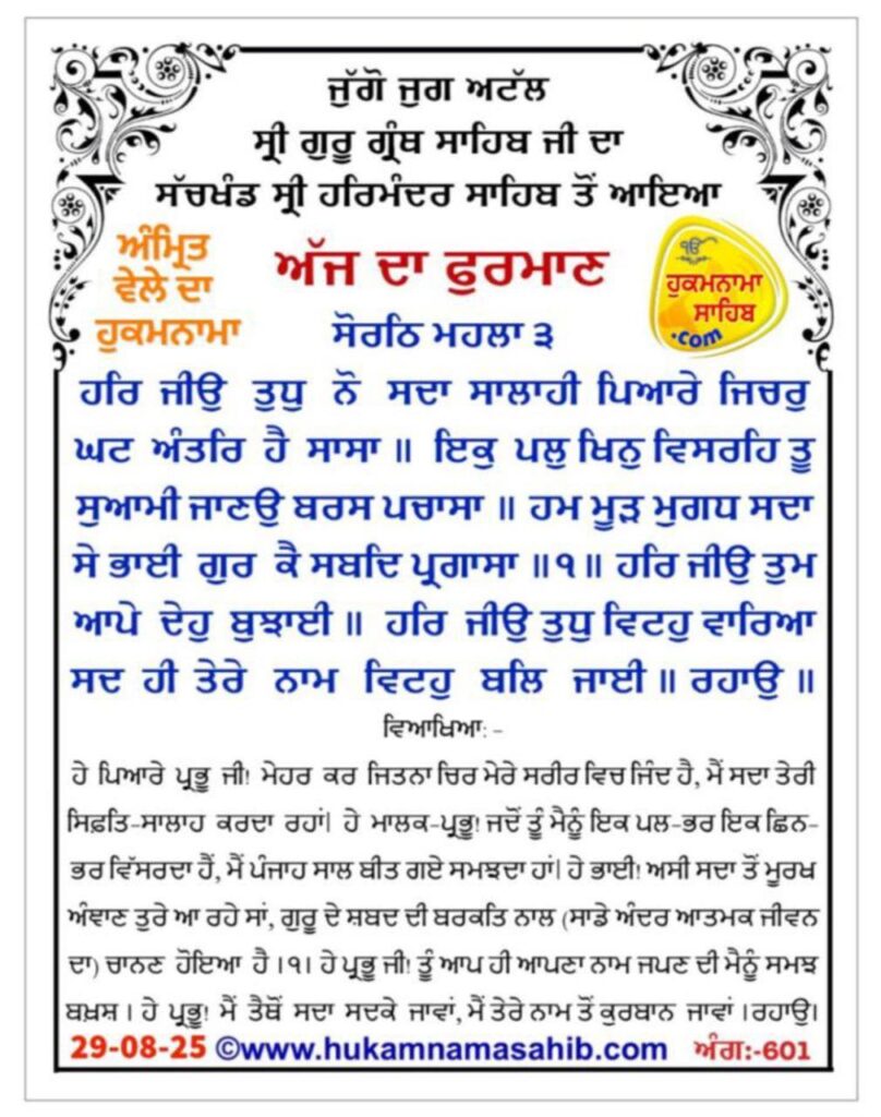 ਸੱਚਖੰਡ ਸ੍ਰੀ ਹਰਿਮੰਦਰ ਸਾਹਿਬ, ਸ੍ਰੀ ਅੰਮ੍ਰਿਤਸਰ, 29-08-2025