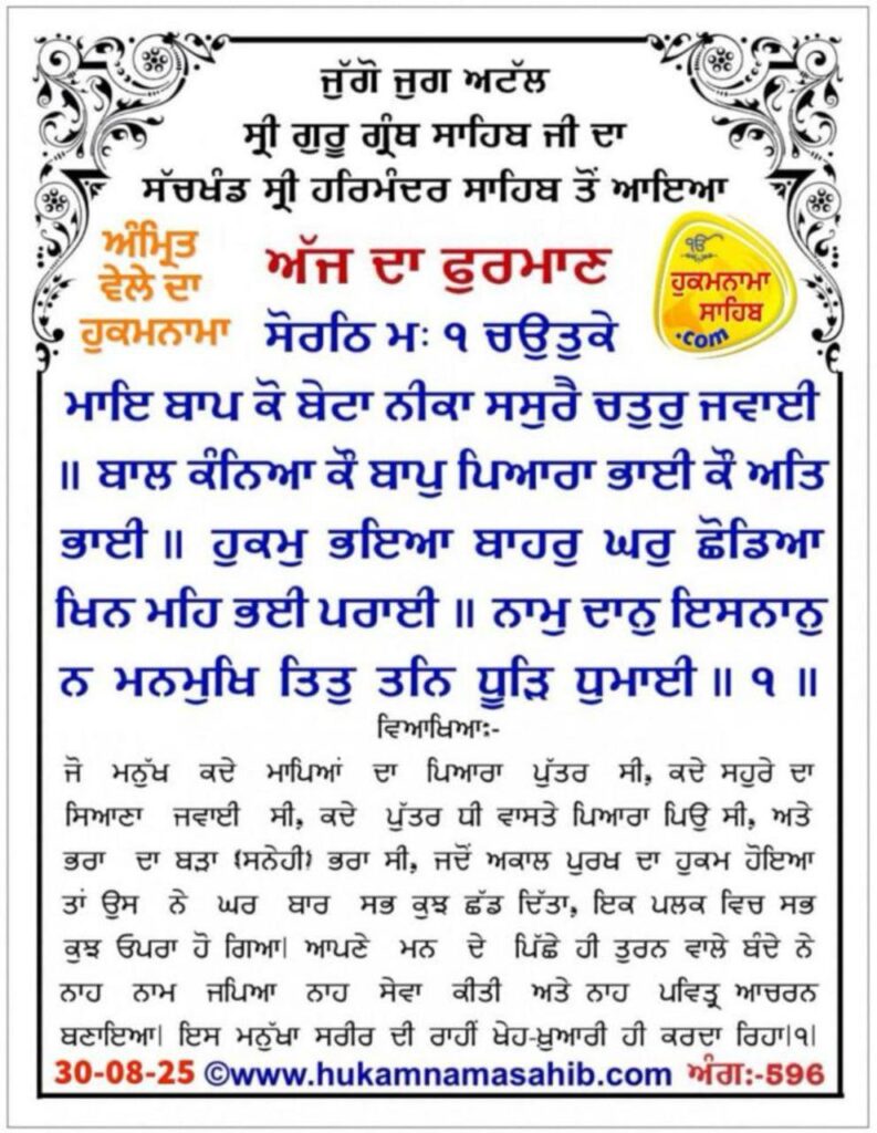 ਜੋ ਮਨੁੱਖ ਕਦੇ ਮਾਪਿਆਂ ਦਾ ਪਿਆਰਾ ਪੁੱਤਰ ਸੀ, ਕਦੇ ਸਹੁਰੇ ਦਾ ਸਿਆਣਾ ਜਵਾਈ ਸੀ, ਕਦੇ ਪੁੱਤਰ ਧੀ ਵਾਸਤੇ ਪਿਆਰਾ ਪਿਉ ਸੀ, ਅਤੇ ਭਰਾ ਦਾ ਬੜਾ (ਸਨੇਹੀ) ਭਰਾ ਸੀ, ਜਦੋਂ ਅਕਾਲ ਪੁਰਖ ਦਾ ਹੁਕਮ ਹੋਇਆ ਤਾਂ ਉਸ ਨੇ ਘਰ ਬਾਰ (ਸਭ ਕੁਝ) ਛੱਡ ਦਿੱਤਾ, ਇਕ ਪਲਕ ਵਿਚ ਸਭ ਕੁਝ ਓਪਰਾ ਹੋ ਗਿਆ । ਆਪਣੇ ਮਨ ਦੇ ਪਿੱਛੇ ਹੀ ਤੁਰਨ ਵਾਲੇ ਬੰਦੇ ਨੇ ਨਾਹ ਨਾਮ ਜਪਿਆ ਨਾਹ ਸੇਵਾ ਕੀਤੀ ਅਤੇ ਨਾਹ ਪਵਿਤ੍ਰ ਆਚਰਨ ਬਣਾਇਆ । ਇਸ ਮਨੁੱਖਾ ਸਰੀਰ ਦੀ ਰਾਹੀਂ ਖੇਹ-ਖ਼ੁਆਰੀ ਹੀ ਕਰਦਾ ਰਿਹਾ ।੧।ਜਿਸ ਮਨੁੱਖ ਦਾ ਮਨ ਗੁਰੂ ਦੇ ਉਪਦੇਸ਼ ਵਿਚ ਪਤੀਜਦਾ ਹੈ ਉਹ ਪਰਮਾਤਮਾ ਦੇ ਨਾਮ ਨੂੰ ਅਸਲ ਮਿਤ੍ਰ ਸਮਝਦਾ ਹੈ । ਮੈਂ ਤਾਂ ਗੁਰੂ ਦੇ ਪੈਰੀਂ ਲੱਗਦਾ ਹਾਂ, ਗੁਰੂ ਤੋਂ ਸਦਕੇ ਜਾਂਦਾ ਹਾਂ ਜਿਸ ਨੇ ਇਹ ਸੱਚੀ ਮਤਿ ਦਿੱਤੀ ਹੈ (ਕਿ ਪਰਮਾਤਮਾ ਹੀ ਅਸਲ ਮਿਤ੍ਰ ਹੈ) ।੧।ਮਨਮੁਖ ਦਾ ਮਨ ਜਗਤ ਨਾਲ ਝੂਠੇ ਪਿਆਰ ਵਿਚ ਪ੍ਰੋਇਆ ਰਹਿੰਦਾ ਹੈ, ਸੰਤ ਜਨਾਂ ਨਾਲ ਉਹ ਝਗੜਾ ਖੜਾ ਕਰੀ ਰੱਖਦਾ ਹੈ । ਮਾਇਆ (ਦੇ ਮੋਹ) ਵਿਚ ਮਸਤ ਉਹ ਦਿਨ ਰਾਤ ਮਾਇਆ ਦਾ ਰਾਹ ਹੀ ਤੱਕਦਾ ਰਹਿੰਦਾ ਹੈ, ਪਰਮਾਤਮਾ ਦਾ ਨਾਮ ਕਦੇ ਨਹੀਂ ਸਿਮਰਦਾ, ਇਸ ਤਰ੍ਹਾਂ (ਮਾਇਆ ਦੇ ਮੋਹ ਦੀ) ਜ਼ਹਿਰ ਖਾ ਖਾ ਕੇ ਆਤਮਕ ਮੌਤੇ ਮਰ ਜਾਂਦਾ ਹੈ । ਆਪਣੇ ਮਨ ਦੇ ਪਿੱਛੇ ਤੁਰਨ ਵਾਲਾ ਮਨੁੱਖ ਗੰਦੇ ਗੀਤਾਂ (ਗਾਵਣ ਸੁਣਨ) ਵਿਚ ਮਸਤ ਰਹਿੰਦਾ ਹੈ, ਗੰਦੇ ਗੀਤ ਨਾਲ ਹੀ ਹਿਤ ਕਰਦਾ ਹੈ, ਪਰਮਾਤਮਾ ਦੀ ਸਿਫ਼ਤਿ-ਸਾਲਾਹ ਵਾਲੀ ਬਾਣੀ ਵਿਚ ਉਸ ਦੀ ਸੁਰਤਿ ਨਹੀਂ ਲੱਗਦੀ । ਨਾਹ ਉਹ ਪਰਮਾਤਮਾ ਦੇ ਪਿਆਰ ਵਿਚ ਰੰਗੀਜਦਾ ਹੈ, ਨਾਹ ਉਸ ਨੂੰ ਨਾਮ-ਰਸ ਵਿਚ ਖਿੱਚ ਪੈਂਦੀ ਹੈ । ਮਨਮੁਖ ਇਸੇ ਤਰ੍ਹਾਂ ਆਪਣੀ ਇੱਜ਼ਤ ਗਵਾ ਲੈਂਦਾ ਹੈ ।੨।ਸਾਧ ਸੰਗਤਿ ਵਿਚ ਜਾ ਕੇ ਮਨਮੁਖ ਆਤਮਕ ਅਡੋਲਤਾ ਦਾ ਆਨੰਦ ਕਦੇ ਨਹੀਂ ਮਾਣਦਾ, ਉਸ ਦੀ ਜੀਭ ਨੂੰ ਨਾਮ ਜਪਣ ਦਾ ਸੁਆਦ ਕਦੇ ਰਤਾ ਭੀ ਨਹੀਂ ਆਉਂਦਾ । ਮਨਮੁਖ ਆਪਣੇ ਮਨ ਨੂੰ ਤਨ ਨੂੰ ਧਨ ਨੂੰ ਹੀ ਆਪਣਾ ਸਮਝੀ ਬੈਠਦਾ ਹੈ, ਪਰਮਾਤਮਾ ਦੇ ਦਰ ਦੀ ਉਸ ਨੂੰ ਕੋਈ ਖ਼ਬਰ-ਸੂਝ ਨਹੀਂ ਪੈਂਦੀ । ਮਨਮੁਖ ਅੰਨ੍ਹਾ (ਜੀਵਨ ਸਫ਼ਰ ਵਿਚ) ਅੱਖਾਂ ਮੀਟ ਕੇ ਹੀ ਤੁਰਿਆ ਜਾਂਦਾ ਹੈ, ਹੇ ਭਾਈ! ਪਰਮਾਤਮਾ ਦਾ ਘਰ ਪਰਮਾਤਮਾ ਦਾ ਦਰ ਉਸ ਨੂੰ ਕਦੇ ਦਿੱਸਦਾ ਹੀ ਨਹੀਂ । ਆਖ਼ਰ ਆਪਣੇ ਕੀਤੇ ਦਾ ਇਹ ਨਫ਼ਾ ਖੱਟਦਾ ਹੈ ਕਿ ਜਮਰਾਜ ਦੇ ਬੂਹੇ ਤੇ ਬੱਝਾ ਹੋਇਆ (ਚੋਟਾਂ ਖਾਂਦਾ ਹੈ, ਇਸ ਸਜ਼ਾ ਤੋਂ ਬਚਣ ਲਈ) ਉਸ ਨੂੰ ਕੋਈ ਸਹਾਰਾ ਨਹੀਂ ਲੱਭਦਾ ।੩।(ਪਰ ਅਸਾਂ ਜੀਵਾਂ ਦੇ ਕੀਹ ਵੱਸ?) ਜੇ ਪ੍ਰਭੂ ਆਪ ਮੇਹਰ ਦੀ ਨਜ਼ਰ ਕਰੇ ਤਾਂ ਹੀ ਮੈਂ ਉਸ ਨੂੰ ਅੱਖਾਂ ਨਾਲ ਵੇਖ ਸਕਦਾ ਹਾਂ, ਉਸ ਦੇ ਗੁਣਾਂ ਦਾ ਬਿਆਨ ਨਹੀਂ ਕੀਤਾ ਜਾ ਸਕਦਾ । (ਉਸ ਦੀ ਮੇਹਰ ਹੋਵੇ ਤਾਂ ਹੀ) ਕੰਨਾਂ ਨਾਲ ਉਸ ਦੀ ਸਿਫ਼ਤਿ-ਸਾਲਾਹ ਸੁਣ ਸੁਣ ਕੇ ਗੁਰੂ ਦੇ ਸ਼ਬਦ ਦੀ ਰਾਹੀਂ ਉਸ ਦੀ ਸਿਫ਼ਤਿ-ਸਾਲਾਹ ਮੈਂ ਕਰ ਸਕਦਾ ਹਾਂ, ਤੇ ਅਟੱਲ ਆਤਮਕ ਜੀਵਨ ਦੇਣ ਵਾਲਾ ਉਸ ਦਾ ਨਾਮ ਹਿਰਦੇ ਵਿਚ ਵਸਾ ਸਕਦਾ ਹਾਂ ।ਹੇ ਨਾਨਕ! ਪ੍ਰਭੂ ਨਿਰਭਉ ਹੈ ਨਿਰ-ਆਕਾਰ ਹੈ ਨਿਰਵੈਰ ਹੈ ਉਸ ਦੀ ਜੋਤਿ ਸਾਰੇ ਜਗਤ ਵਿਚ ਪੂਰਨ ਤੌਰ ਤੇ ਵਿਆਪਕ ਹੈ, ਉਸ ਦੇ ਸਦਾ-ਥਿਰ ਰਹਿਣ ਵਾਲੇ ਨਾਮ ਵਿਚ ਟਿਕਿਆਂ ਹੀ ਆਦਰ ਮਿਲਦਾ ਹੈ, ਪਰ ਗੁਰੂ ਦੀ ਸ਼ਰਨ ਤੋਂ ਬਿਨਾ ਮਨ ਦੀ ਭਟਕਣਾ ਦੂਰ ਨਹੀਂ ਹੁੰਦੀ (ਤੇ ਭਟਕਣਾ ਦੂਰ ਹੋਣ ਤੋਂ ਬਿਨਾ ਨਾਮ ਵਿਚ ਜੁੜ ਨਹੀਂ ਸਕੀਦਾ) ।੪।੩।