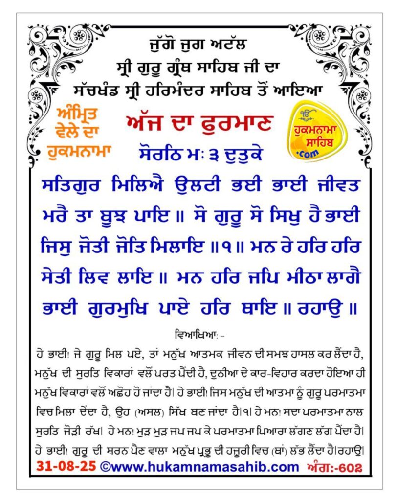 ਹੇ ਭਾਈ! ਜੇ ਗੁਰੂ ਮਿਲ ਪਏ, ਤਾਂ ਮਨੁੱਖ ਆਤਮਕ ਜੀਵਨ ਦੀ ਸਮਝ ਹਾਸਲ ਕਰ ਲੈਂਦਾ ਹੈ, ਮਨੁੱਖ ਦੀ ਸੁਰਤਿ ਵਿਕਾਰਾਂ ਵਲੋਂ ਪਰਤ ਪੈਂਦੀ ਹੈ, ਦੁਨੀਆ ਦੇ ਕਾਰ-ਵਿਹਾਰ ਕਰਦਾ ਹੋਇਆ ਹੀ ਮਨੁੱਖ ਵਿਕਾਰਾਂ ਵਲੋਂ ਅਛੋਹ ਹੋ ਜਾਂਦਾ ਹੈ । ਹੇ ਭਾਈ! ਜਿਸ ਮਨੁੱਖ ਦੀ ਆਤਮਾ ਨੂੰ ਗੁਰੂ ਪਰਮਾਤਮਾ ਵਿਚ ਮਿਲਾ ਦੇਂਦਾ ਹੈ, ਉਹ (ਅਸਲ) ਸਿੱਖ ਬਣ ਜਾਂਦਾ ਹੈ ।੧।