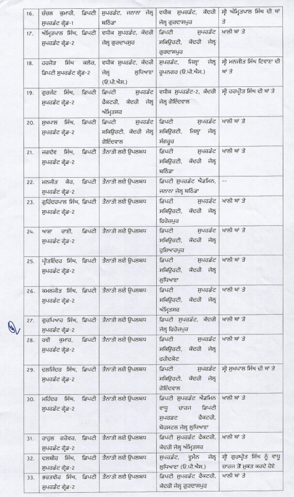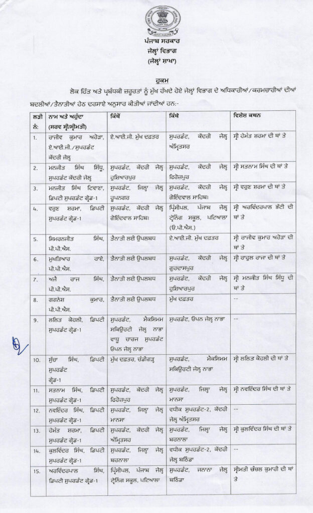 ਪੰਜਾਬ ਸਰਕਾਰ ਵੱਲੋਂ ਜੇਲ੍ਹ ਵਿਭਾਗ ਦੇ ਅਧਿਕਾਰੀਆਂ ਤੇ ਕਰਮਚਾਰੀਆਂ ਦੀਆਂ ਬਦਲੀਆਂ