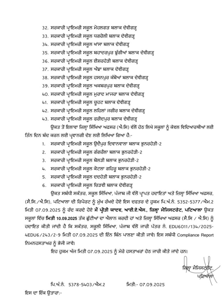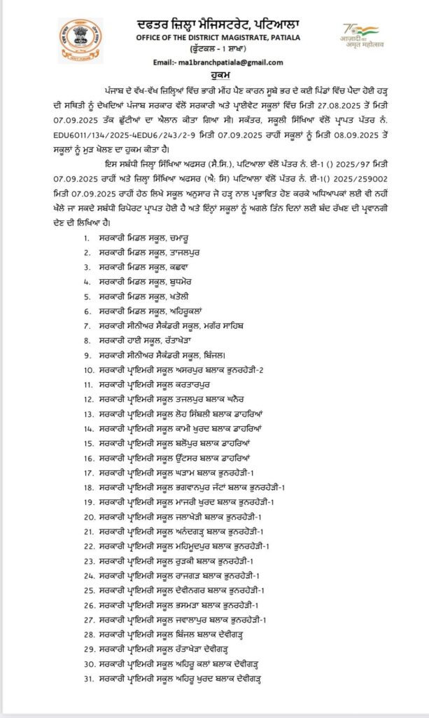 ਮੌਸਮ ਖਰਾਬ ਕਾਰਨ ਸਰਕਾਰ ਵੱਲੋਂ ਸਕੂਲਾਂ ਵਿੱਚ ਕੀਤੀਆਂ ਗਈਆਂ ਛੁੱਟੀਆਂ ਤੋਂ ਬਾਅਦ ਅੱਜ ਸਕੂਲ ਖੋਲ੍ਹਣ ਦਾ ਐਲਾਨ ਕੀਤਾ ਗਿਆ ਹੈ। ਆਏ ਹੜ੍ਹ ਕਾਰਨ ਕੁਝ ਜ਼ਿਲ੍ਹਿਆਂ ਵਿੱਚ ਹਾਲਾਤਾਂ ਨੂੰ ਦੇਖਦੇ ਹੋਏ ਡਿਪਟੀ ਕਮਿਸ਼ਨਰਾਂ ਵੱਲੋਂ ਕਈ ਸਕੂਲਾਂ ਨੂੰ ਬੰਦ ਰੱਖਣ ਦੇ ਹੁਕਮ ਜਾਰੀ ਕੀਤੇ ਗਏ ਹਨ। ਪਟਿਆਲਾ ਜਿਲ਼੍ਹੇ ਦੇ 43 ਸਕੂਲਾਂ ਵਿੱਚ 10 ਸਤੰਬਰ ਤੱਕ ਛੁੱਟੀਆਂ ਦਾ ਐਲਾਨ ਕੀਤਾ ਗਿਆ ਹੈ। ਡਿਪਟੀ ਕਮਿਸ਼ਨਰ ਪਟਿਆਲਾ ਡਾ. ਪ੍ਰੀਤੀ ਯਾਦਵ ਵਲੋਂ ਜਾਰੀ ਹੁਕਮਾਂ ਮੁਤਾਬਕ ਹੜ੍ਹਾਂ ਕਰਕੇ ਪਟਿਆਲਾ ਜ਼ਿਲ੍ਹੇ ਦੇ 43 ਸਕੂਲ ਅਧਿਆਪਕਾਂ ਤੇ ਵਿਦਿਆਰਥੀਆਂ ਲਈ ਮਿਤੀ 10.09.2025 ਤੱਕ ਲਈ ਬੰਦ ਰਹਿਣਗੇ ਜਦਕਿ ਕੇਵਲ 06 ਸਕੂਲਾਂ ਨੂੰ ਕੇਵਲ ਵਿਦਿਆਰਥੀਆਂ ਲਈ ਹੀ ਬੰਦ ਕੀਤਾ ਗਿਆ ਹੈ। ਇਨ੍ਹਾਂ ਸਕੂਲਾਂ ‘ਚ 3 ਛੁੱਟੀਆਂ ਕੀਤੀਆਂ ਗਈਆਂ ਹਨ। ਇਸ ਤੋਂ ਇਲਾਵਾ ਬਾਕੀ ਨਿਜੀ ਤੇ ਸਰਕਾਰੀ ਸਕੂਲ ਸਰਕਾਰ ਦੇ ਹੁਕਮਾਂ ਅਨੁਸਾਰ ਹੀ ਖੁੱਲ੍ਹਣਗੇ।