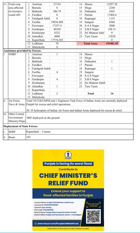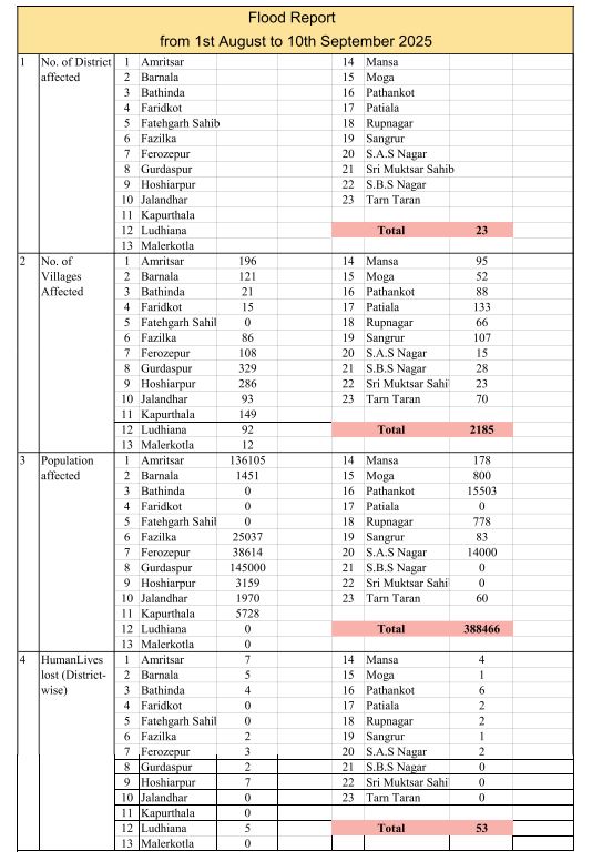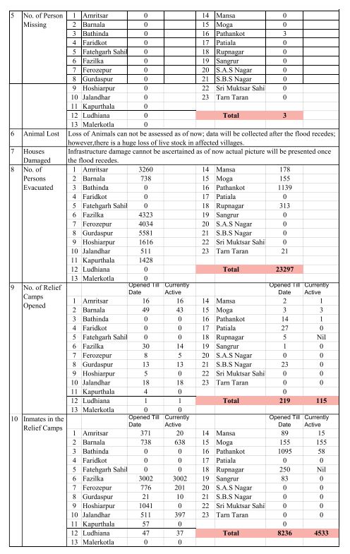 ਪੰਜਾਬ ਵਿੱਚ ਆਏ ਹੜ੍ਹਾਂ ਦੀ ਮਾਰ ਹੇਠ 23 ਜ਼ਿਲ੍ਹੇ ਪ੍ਰਭਾਵਿਤ ਹਨ। ਪੰਜਾਬ ਦੇ 2185 ਪਿੰਡ ਹੜ੍ਹ ਦੀ ਮਾਰ ਹੇਠ ਹਨ, ਸਭ ਤੋਂ ਜ਼ਿਆਦਾ ਅੰਮ੍ਰਿਤਸਰ ਦੇ 196 ਪਿੰਡ ਪ੍ਰਭਾਵਿਤ ਹਨ। ਹੜ੍ਹਾਂ ਨਾਲ ਪੰਜਾਬ ਦੇ 388466 ਲੋਕ ਪ੍ਰਭਾਵਿਤ ਹੋਏ ਹਨ। ਹੜ੍ਹਾਂ ਦੌਰਾਨ 53 ਲੋਕਾਂ ਦੀ ਕੀਮਤੀ ਜਾਨ ਚਲੀ ਗਈ, ਸਭ ਤੋਂ ਵੱਧ ਅੰਮ੍ਰਿਤਸਰ ਵਿੱਚ 7 ਹਨ।