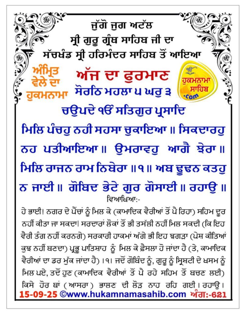 ਸੱਚਖੰਡ ਸ੍ਰੀ ਹਰਿਮੰਦਰ ਸਾਹਿਬ, ਸ੍ਰੀ ਅੰਮ੍ਰਿਤਸਰ, 15-09-2025