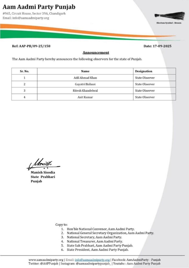 ਆਮ ਆਦਮੀ ਪਾਰਟੀ ਨੇ ਪੰਜਾਬ ’ਚ ਲਗਾਏ 4 ਨਵੇਂ ਆਬਜ਼ਰਵਰ ਪੰਜਾਬ ਸਤੰਬਰ 17, 2025ਸਤੰਬਰ 17, 2025Leave a Comment on ਆਮ ਆਦਮੀ ਪਾਰਟੀ ਨੇ ਪੰਜਾਬ ’ਚ ਲਗਾਏ 4 ਨਵੇਂ ਆਬਜ਼ਰਵਰ ਚੰਡੀਗੜ੍ਹ, 17 ਸਤੰਬਰ, ਦੇਸ਼ ਕਲਿੱਕ ਬਿਓਰੋ : ਆਮ ਆਦਮੀ ਪਾਰਟੀ ਵੱਲੋਂ ਪੰਜਾਬ ਵਿੱਚ 4 ਨਵੇਂ ਆਬਜ਼ਰਵਰਾਂ ਦਾ ਐਲਾਨ ਕੀਤਾ ਗਿਆ ਹੈ।