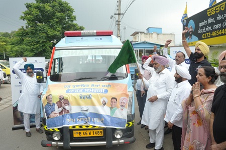 ਪੰਜਾਬ ਦੇ ਵਿੱਤ ਮੰਤਰੀ ਐਡਵੋਕੇਟ ਹਰਪਾਲ ਸਿੰਘ ਚੀਮਾ ਨੇ ਅੱਜ ਹੜ੍ਹ ਪ੍ਰਭਾਵਿਤ ਖੇਤਰਾਂ ਦੇ ਲੋਕਾਂ ਨੂੰ ਡਾਕਟਰੀ ਸੇਵਾਵਾਂ ਪ੍ਰਦਾਨ ਕਰਨ ਲਈ ਮੋਹਾਲੀ ਤੋਂ ਤਿੰਨ ਐਂਬੂਲੈਂਸਾਂ ਨੂੰ ਹਰੀ ਝੰਡੀ ਦੇ ਕੇ ਰਵਾਨਾ ਕੀਤਾ।