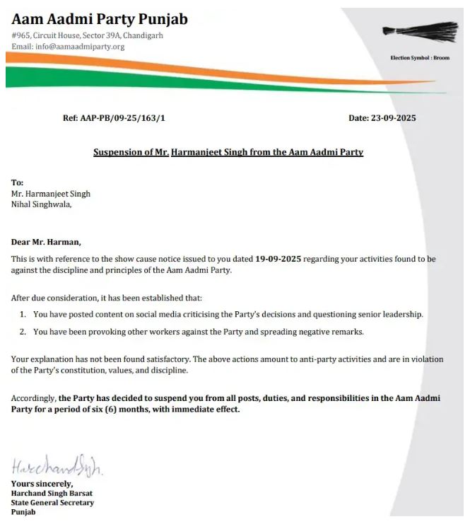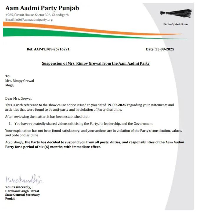 ਪਾਰਟੀ ਵਿਰੋਧੀ ਕਾਰਵਾਈ ਨੂੰ ਲੈ ਕੇ ਆਮ ਆਦਮੀ ਪਾਰਟੀ ਨੇ ਦੋ ਆਗੂਆਂ ਖਿਲਾਫ ਕਾਰਵਾਈ ਕਰਦੇ ਹੋਏ ਪਾਰਟੀ ਵਿਚੋਂ 6 ਮਹੀਨਿਆਂ ਲਈ ਮੁਅੱਤਲ ਕੀਤਾ ਗਿਆ ਹੈ। ਮੋਗਾ ਵਿਚ ਆਮ ਆਦਮੀ ਪਾਰਟੀ ਨੇ ਸਾਬਕਾ ਜ਼ਿਲ੍ਹਾ ਪ੍ਰਧਾਨ ਹਰਮਨਜੀਤ ਸਿੰਘ ਅਤੇ ਪੰਜਾਬ ਮਹਿਲਾ ਵਿੰਗ ਦੀ ਉਪ ਪ੍ਰਧਾਨ ਅਤੇ ਜੇਲ੍ਹ ਸੁਧਾਰ ਬੋਰਡ ਦੀ ਮੈਂਬਰ ਰਿੰਪੀ ਗਰੇਵਾਲ ਨੂੰ ਛੇ ਮਹੀਨਿਆਂ ਲਈ ਪਾਰਟੀ ਵਿਚੋਂ ਮੁਅੱਤਲ ਕਰ ਦਿੱਤਾ ਗਿਆ ਹੈ।