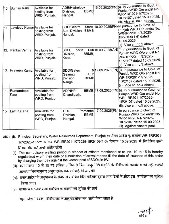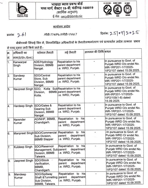 BBMB ਵੱਲੋਂ ਸਿੰਚਾਈ ਵਿੰਗ ’ਚ ਅਧਿਕਾਰੀਆਂ ਦੀਆਂ ਬਦਲੀਆਂ ਪੰਜਾਬ ਸਤੰਬਰ 26, 2025ਸਤੰਬਰ 26, 2025Leave a Comment on BBMB ਵੱਲੋਂ ਸਿੰਚਾਈ ਵਿੰਗ ’ਚ ਅਧਿਕਾਰੀਆਂ ਦੀਆਂ ਬਦਲੀਆਂ ਚੰਡੀਗੜ੍ਹ, 26 ਸਤੰਬਰ, ਦੇਸ਼ ਕਲਿੱਕ ਬਿਓਰੋ : ਭਾਖੜਾ ਬਿਆਸ ਪ੍ਰਬੰਧ ਬੋਰਡ (BBMB) ਵੱਲੋਂ ਸਿੰਚਾਈ ਵਿੰਗ ਵਿੱਚ ਅਧਿਕਾਰੀਆਂ ਦੀਆਂ ਬਦਲੀਆਂ ਕੀਤੀਆਂ ਗਈਆਂ ਹਨ। ਇਹ ਬਦਲੀਆਂ ਤੁਰੰਤ ਪ੍ਰਭਾਵ ਨਾਲ ਲਾਗੂ ਕੀਤੀਆਂ ਗਈਆਂ ਹਨ।