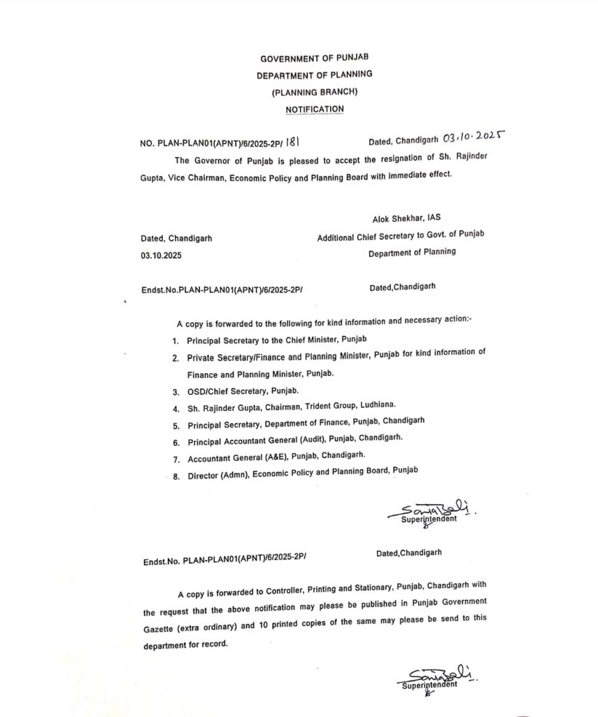 ਰਜਿੰਦਰ ਗੁਪਤਾ ਦਾ ਅਸਤੀਫਾ ਮਨਜ਼ੂਰ ਪੰਜਾਬ ਅਕਤੂਬਰ 4, 2025ਅਕਤੂਬਰ 4, 2025Leave a Comment on ਰਜਿੰਦਰ ਗੁਪਤਾ ਦਾ ਅਸਤੀਫਾ ਮਨਜ਼ੂਰ ਚੰਡੀਗੜ੍ਹ, 4 ਅਕਤੂਬਰ, ਦੇਸ਼ ਕਲਿੱਕ ਬਿਓਰੋ : ਟਰਾਈਡੈਂਟ ਗਰੁੱਪ ਦੇ ਸੰਸਥਾਪਕ ਰਜਿੰਦਰ ਗੁਪਤਾ ਵੱਲੋਂ ਯੋਜਨਾ ਬੋਰਡ ਪੰਜਾਬ ਦੇ ਵਾਈਸ ਚੇਅਰਮੈਨੀ ਦੇ ਅਹੁਦੇ ਤੋਂ ਦਿੱਤਾ ਗਿਆ ਅਸਤੀਫਾ ਮਨਜ਼ੂਰ ਕਰ ਲਿਆ ਗਿਆ ਹੈ। ਪੰਜਾਬ ਦੇ ਰਾਜਪਾਲ ਵੱਲੋਂ ਰਜਿੰਦਰ ਗੁਪਤਾ ਦਾ ਦਿੱਤਾ ਗਿਆ ਅਸਤੀਫਾ ਮਨਜ਼ੂਰ ਕੀਤਾ ਗਿਆ ਹੈ।