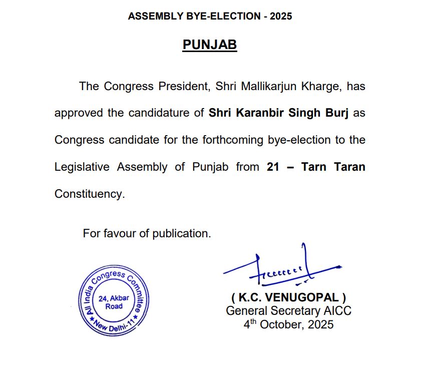 ਕਾਂਗਰਸ ਨੇ ਤਰਨ ਤਾਰਨ ਤੋਂ ਐਲਾਨਿਆਂ ਉਮੀਦਵਾਰ ਪੰਜਾਬ ਅਕਤੂਬਰ 4, 2025ਅਕਤੂਬਰ 4, 2025Leave a Comment on ਕਾਂਗਰਸ ਨੇ ਤਰਨ ਤਾਰਨ ਤੋਂ ਐਲਾਨਿਆਂ ਉਮੀਦਵਾਰ ਚੰਡੀਗੜ੍ਹ, 4 ਅਕਤੂਬਰ, ਦੇਸ਼ ਕਲਿੱਕ ਬਿਓਰੋ : ਕਾਂਗਰਸ ਪਾਰਟੀ ਨੇ ਤਰਨਤਾਰਨ ਜ਼ਿਮਨੀ ਚੋਣ ਲਈ ਆਪਣੇ ਉਮੀਦਵਾਰ ਦਾ ਐਲਾਨ ਕਰ ਦਿੱਤਾ ਹੈ। ਕਾਂਗਰਸ ਵੱਲੋਂ ਕਰਨਬੀਰ ਸਿੰਘ ਬੁਰਜ ਨੂੰ ਆਪਣਾ ਉਮੀਦਵਾਰ ਐਲਾਨਿਆ ਹੈ।