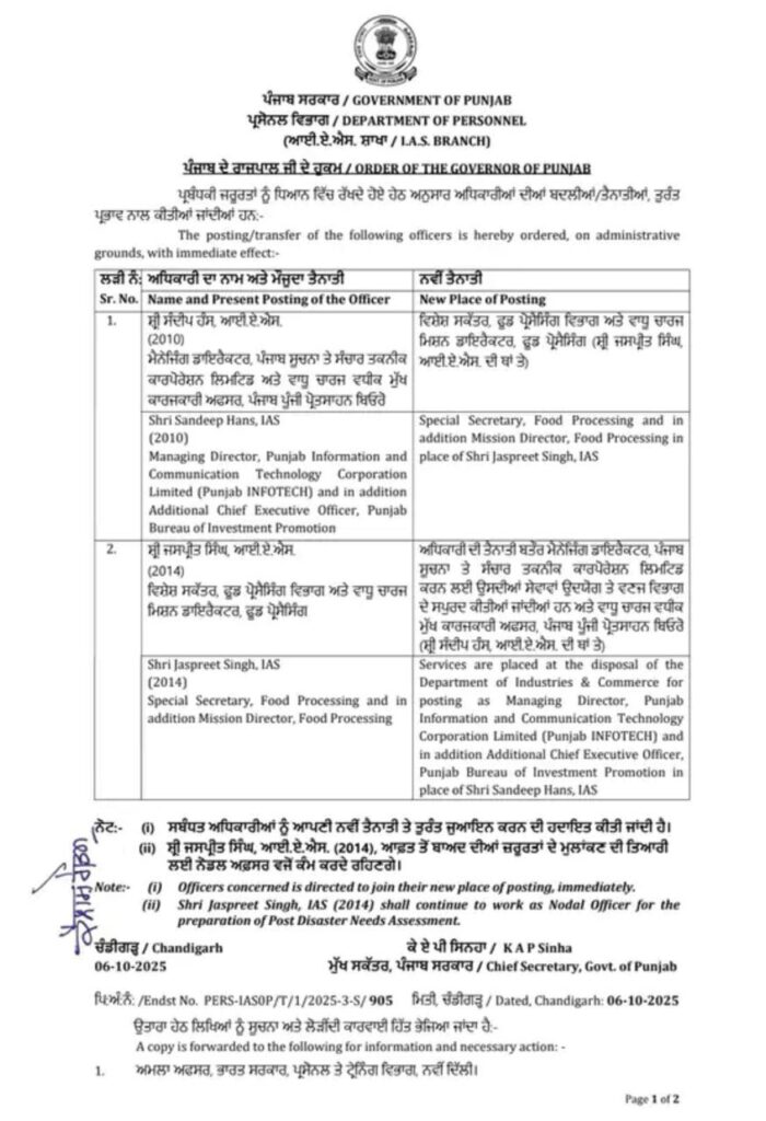 ਪੰਜਾਬ ਸਰਕਾਰ ਨੇ ਦੋ ਆਈਏਐਸ ਅਧਿਕਾਰੀਆਂ ਦਾ ਤਬਾਦਲਾ ਕਰ ਦਿੱਤਾ ਹੈ। ਇਸ ਵਿੱਚ ਆਈਏਐਸ ਸੰਦੀਪ ਹੰਸ ਫੂਡ ਪ੍ਰੋਸੈਸਿੰਗ ਵਿਭਾਗ ਦੇ ਵਿਸ਼ੇਸ਼ ਸਕੱਤਰ ਦੀ ਜ਼ਿੰਮੇਵਾਰੀ ਸੰਭਾਲਣਗੇ, ਨਾਲ ਹੀ ਫੂਡ ਪ੍ਰੋਸੈਸਿੰਗ ਮਿਸ਼ਨ ਦੇ ਡਾਇਰੈਕਟਰ ਦੀ ਜ਼ਿੰਮੇਵਾਰੀ ਵੀ ਸੰਭਾਲਣਗੇ। ਇਹ ਜ਼ਿੰਮੇਵਾਰੀ ਪਹਿਲਾਂ ਆਈਏਐਸ ਜਸਪ੍ਰੀਤ ਸਿੰਘ ਕੋਲ ਸੀ।
