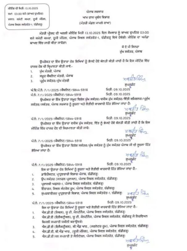 ਪੰਜਾਬ ਮੰਤਰੀ ਮੰਡਲ ਦੀ ਅਹਿਮ ਮੀਟਿੰਗ 13 ਨੂੰ ਪੰਜਾਬ ਅਕਤੂਬਰ 9, 2025ਅਕਤੂਬਰ 9, 2025Leave a Comment on ਪੰਜਾਬ ਮੰਤਰੀ ਮੰਡਲ ਦੀ ਅਹਿਮ ਮੀਟਿੰਗ 13 ਨੂੰ ਚੰਡੀਗੜ੍ਹ, 9 ਅਕਤੂਬਰ, ਦੇਸ਼ ਕਲਿੱਕ ਬਿਓਰੋ : ਪੰਜਾਬ ਮੰਤਰੀ ਮੰਡਲ ਦੀ ਅਹਿਮ ਮੀਟਿੰਗ 13 ਅਕਤੂਬਰ ਨੂੰ ਬੁਲਾਈ ਗਈ ਹੈ। ਇਹ ਮੀਟਿੰਗ ਮੁੱਖ ਮੰਤਰੀ ਭਗਵੰਤ ਮਾਨ ਦੀ ਪ੍ਰਧਾਨਗੀ ਵਿੱਚ ਦੁਪਹਿਰ 3 ਵਜੇ ਚੰਡੀਗੜ੍ਹ ਵਿਖੇ ਹੋਵੇਗੀ।