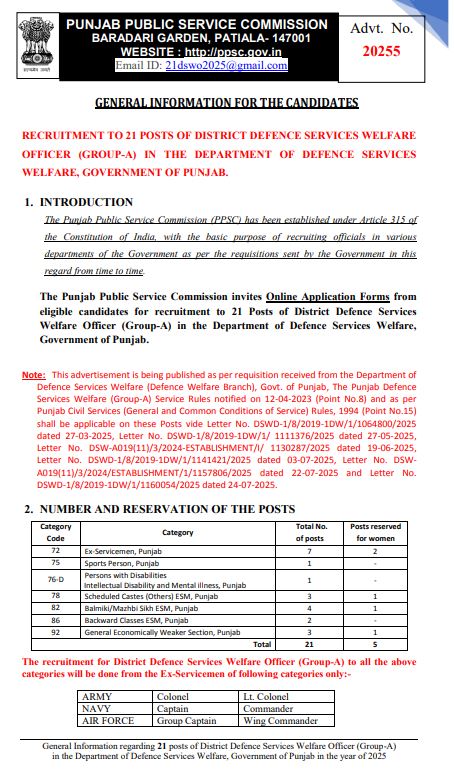 ਪੰਜਾਬ ਪਬਲਿਕ ਸਰਵਿਸ ਕਮਿਸ਼ਨ (PPSC) ਵੱਲੋਂ ਅਸਾਮੀਆਂ ਕੱਢੀਆਂ ਗਈਆਂ ਹਨ। ਪੀਪੀਐਸਸੀ ਵੱਲੋਂ 3 ਨਵੰਬਰ 2025 ਤੱਕ ਯੋਗ ਉਮੀਦਵਾਰਾਂ ਤੋਂ ਅਰਜ਼ੀਆਂ ਦੀ ਮੰਗ ਕੀਤੀ ਗਈ ਹੈ। ਪੰਜਾਬ ਪਬਲਿਕ ਸਰਵਿਸ ਕਮਿਸ਼ਨ ਨੇ ਜ਼ਿਲ੍ਹਾ ਡੀਫੈਂਸ ਸਰਵਿਸ ਵੈਲਫੇਅਰ (ਗਰੁੱਪ ਏ) ਦੀ ਭਰਤੀ ਲਈ ਅਰਜ਼ੀਆਂ ਮੰਗੀਆਂ ਹਨ।