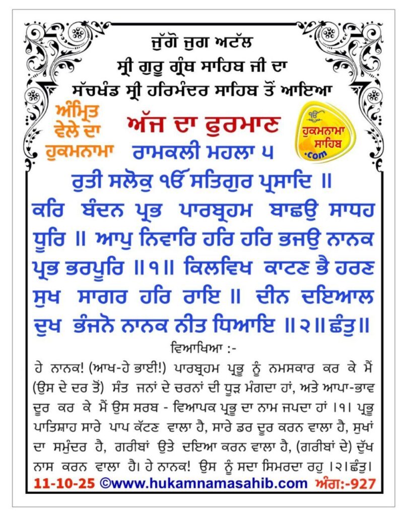 ਸੱਚਖੰਡ ਸ੍ਰੀ ਹਰਿਮੰਦਰ ਸਾਹਿਬ, ਸ੍ਰੀ ਅੰਮ੍ਰਿਤਸਰ, 11-10-2025