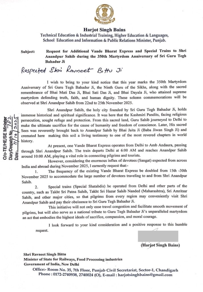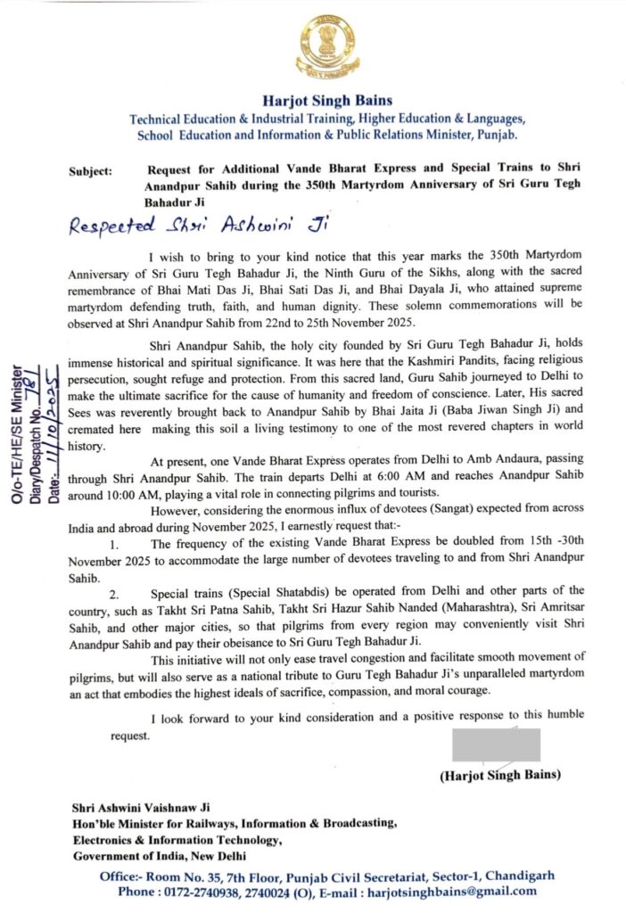 ਕੇਂਦਰੀ ਰੇਲਵੇ ਮੰਤਰੀ ਅਸ਼ਵਨੀ ਵੈਸ਼ਨਵ ਅਤੇ ਕੇਂਦਰੀ ਰਾਜ ਮੰਤਰੀ ਰਵਨੀਤ ਸਿੰਘ ਬਿੱਟੂ ਨੂੰ ਲਿਖੇ ਪੱਤਰ ਵਿੱਚ ਪੰਜਾਬ ਦੇ ਸਿੱਖਿਆ ਮੰਤਰੀ ਹਰਜੋਤ ਸਿੰਘ ਬੈਂਸ ਨੇ ਦੱਸਿਆ ਕਿ ਸ੍ਰੀ ਗੁਰੂ ਤੇਗ਼ ਬਹਾਦਰ ਜੀ ਦੇ 350ਵੇਂ ਸ਼ਹੀਦੀ ਦਿਵਸ ਮੌਕੇ ਸ੍ਰੀ ਅਨੰਦਪੁਰ ਸਾਹਿਬ ਵਿਖੇ ਤਕਰੀਬਨ 1 ਕਰੋੜ ਤੋਂ ਵੱਧ ਸੰਗਤ ਦੇ ਆਉਣ ਦੀ ਉਮੀਦ ਹੈ। ਸ. ਬੈਂਸ ਨੇ ਆਪਣੇ ਪੱਤਰ ਵਿੱਚ ਨਵੀਂ ਦਿੱਲੀ ਤੋਂ ਚੱਲਦੀ ਵੰਦੇ ਭਾਰਤ ਐਕਸਪ੍ਰੈਸ ਦੀਆਂ ਸੇਵਾਵਾਂ ਨੂੰ 15 ਤੋਂ 30 ਨਵੰਬਰ, 2025 ਤੱਕ ਦੁੱਗਣਾ ਕਰਨ ਦੀ ਮੰਗ ਕੀਤੀ। ਉਨ੍ਹਾਂ ਨੇ ਦੇਸ਼ ਭਰ ਦੇ ਪ੍ਰਮੁੱਖ ਅਧਿਆਤਮਿਕ ਕੇਂਦਰਾਂ, ਜਿਨ੍ਹਾਂ ਵਿੱਚ ਤਖ਼ਤ ਸ੍ਰੀ ਪਟਨਾ ਸਾਹਿਬ, ਤਖ਼ਤ ਸ੍ਰੀ ਹਜ਼ੂਰ ਸਾਹਿਬ ਨਾਂਦੇੜ (ਮਹਾਰਾਸ਼ਟਰ), ਸ੍ਰੀ ਅੰਮ੍ਰਿਤਸਰ ਸਾਹਿਬ ਅਤੇ ਹੋਰ ਪ੍ਰਮੁੱਖ ਸ਼ਹਿਰਾਂ, ਤੋਂ ਵਿਸ਼ੇਸ਼ ਯਾਤਰੀ ਰੇਲਗੱਡੀਆਂ ਚਲਾਉਣ ਦੀ ਵੀ ਮੰਗ ਕੀਤੀ ਤਾਂ ਜੋ 22 ਤੋਂ 25 ਨਵੰਬਰ, 2025 ਤੱਕ ਸ੍ਰੀ ਅਨੰਦਪੁਰ ਸਾਹਿਬ ਵਿਖੇ ਕਰਵਾਏ ਜਾਣ ਵਾਲੇ ਵੱਡੇ ਸਮਾਗਮਾਂ ਵਿੱਚ ਸ਼ਮੂਲੀਅਤ ਲਈ ਆਉਣ ਵਾਲੀ ਸੰਗਤ ਨੂੰ ਆਉਣ-ਜਾਣ ਵਿੱਚ ਕਿਸੇ ਕਿਸਮ ਦੀ ਦਿੱਕਤ ਦਾ ਸਾਹਮਣਾ ਨਾ ਕਰਨਾ ਪਵੇ।