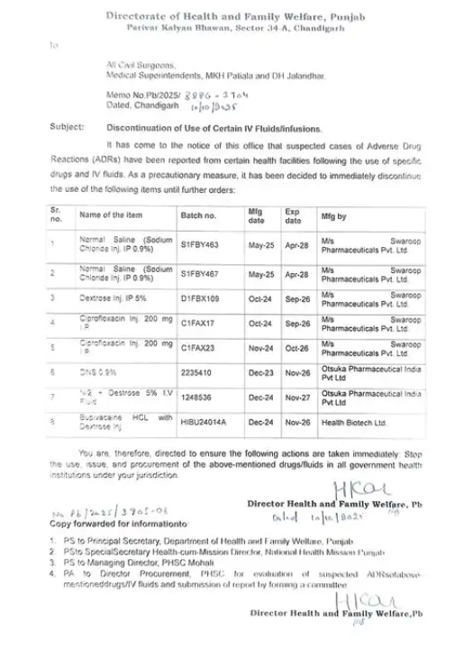 ਪੰਜਾਬ ਸਰਕਾਰ ਨੇ ਕੋਲਡਰਿਫ ਖੰਘ ਸਿਰਪ ‘ਤੇ ਪਾਬੰਦੀ ਲਾਉਣ ਤੋਂ ਬਾਅਦ ਹੁਣ 8 ਹੋਰ ਦਵਾਈਆਂ ਦੀ ਵਰਤੋਂ ਅਤੇ ਵਿਕਰੀ ‘ਤੇ ਪਾਬੰਦੀ ਲਾ ਦਿੱਤੀ ਹੈ। ਇਹ ਫੈਸਲਾ ਸਿਹਤ ਅਤੇ ਪਰਿਵਾਰ ਭਲਾਈ ਵਿਭਾਗ ਦੁਆਰਾ ਜਾਰੀ ਕੀਤੇ ਗਏ ਇੱਕ ਆਦੇਸ਼ ਤੋਂ ਬਾਅਦ ਲਿਆ ਗਿਆ ਹੈ। ਇਸ ਸੰਬੰਧੀ ਸਰਕਾਰ ਵੱਲੋਂ ਹੁਕਨ ਵੀ ਜਾਰੀ ਕਰ ਦਿੱਤੇ ਗਏ ਹਨ, ਜਿਸ ਤਹਿਤ ਤਿੰਨ ਫਾਰਮਾਸਿਊਟੀਕਲ ਕੰਪਨੀਆਂ ਦੀਆਂ ਦਵਾਈਆਂ ‘ਤੇ ਪਾਬੰਦੀ ਲਗਾ ਦਿੱਤੀ ਗਈ ਹੈ। ਇਹ ਦਵਾਈਆਂ ਹੁਣ ਨਾ ਤਾਂ ਮੈਡੀਕਲ ਸਟੋਰਾਂ ਵਿੱਚ ਵੇਚੀਆਂ ਜਾਣਗੀਆਂ ਅਤੇ ਨਾ ਹੀ ਹਸਪਤਾਲਾਂ ਵਿੱਚ ਵਰਤੀਆਂ ਜਾਣਗੀਆਂ। ਇਨ੍ਹਾਂ ਦਵਾਈਆਂ ਦੀ ਲਿਸਟ ਹੇਠਾਂ ਦੇਖੋ…….