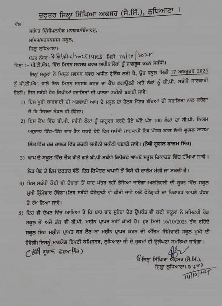 ਜ਼ਿਲ੍ਹਾ ਸਿੱਖਿਆ ਅਧਿਕਾਰੀ (ਸੈਕੰਡਰੀ) ਦੇ ਦਫ਼ਤਰ ਤੋਂ ਜਾਰੀ ਇੱਕ ਪੱਤਰ ਨੇ ਇਸ ਵਾਰ ਅਧਿਆਪਕਾਂ ਨੂੰ ਡਾਕਟਰਾਂ ਵਿੱਚ ਬਦਲ ਦਿੱਤਾ ਹੈ। ਹੁਕਮਾਂ ਅਨੁਸਾਰ, 17 ਅਕਤੂਬਰ ਨੂੰ ਮਾਪੇ-ਅਧਿਆਪਕ ਮੀਟਿੰਗ (PTM) ਦੌਰਾਨ “ਮਿਸ਼ਨ ਸਵਸਥ ਕਵਚ” ਅਧੀਨ ਸਕੂਲਾਂ ਵਿੱਚ ਬਲੱਡ ਪ੍ਰੈਸ਼ਰ ਟੈਸਟਿੰਗ ਕੈਂਪ ਲਗਾਏ ਜਾਣਗੇ। ਇਸ ਦੌਰਾਨ, ਅਧਿਆਪਕ ਅਤੇ ਵਿਦਿਆਰਥੀ ਘੱਟੋ-ਘੱਟ 100 ਮਾਪਿਆਂ ਦੇ ਬਲੱਡ ਪ੍ਰੈਸ਼ਰ ਦੀ ਤਿੰਨ ਵਾਰ ਜਾਂਚ ਕਰਨਗੇ ਅਤੇ ਨਤੀਜਿਆਂ ਨੂੰ ਗੂਗਲ ਫਾਰਮ ਵਿੱਚ ਦਰਜ ਕਰਨਗੇ। ਵਿਭਾਗ ਨੇ ਹਦਾਇਤ ਕੀਤੀ ਹੈ ਕਿ ਪੂਰੇ ਸਮਾਗਮ ਦੀ ਫੋਟੋ ਖਿੱਚੀ ਜਾਵੇ ਅਤੇ ਸਬੂਤ ਵਜੋਂ ਰੱਖੀ ਜਾਵੇ ਤਾਂ ਜੋ ਲੋੜ ਪੈਣ ‘ਤੇ ਰਿਪੋਰਟ ਮੰਗੀ ਜਾ ਸਕੇ।