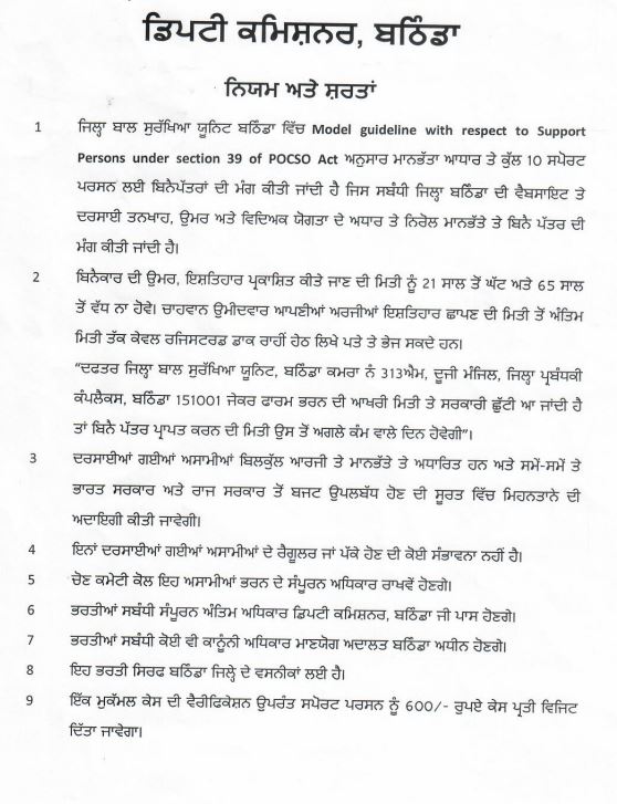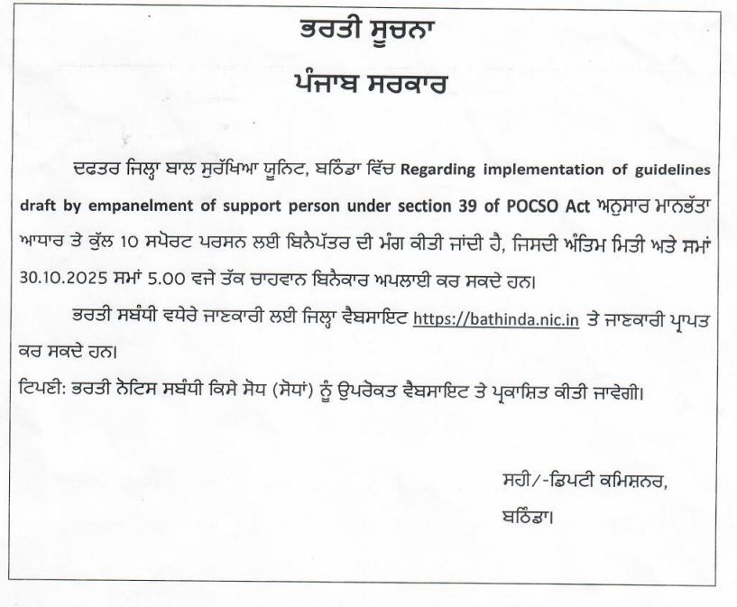 ਜ਼ਿਲ੍ਹਾ ਬਾਲ ਸੁਰੱਖਿਆ ਯੂਨਿਟ ਵਿੱਚ ਸਪੋਰਟ ਪਰਸਨ ਲਈ ਅਰਜ਼ੀਆਂ ਦੀ ਮੰਗ ਕੀਤੀ ਗਈ ਹੈ। ਯੋਗ ਉਮੀਦਵਾਰ 30 ਅਕਤੂਬਰ 2025 ਸਮਾਂ 5 ਵਜੇ ਤੱਕ ਅਰਜ਼ੀਆਂ ਭੇਜ ਸਕਦੇ ਹਨ। ਜ਼ਿਲ੍ਹਾ ਬਾਲ ਸੁਰੱਖਿਆ ਯੂਨਿਟ ਬਠਿੰਡਾ ਵਿਚ 10 ਸਪੋਰਟ ਪਰਸਨ ਲਈ ਅਰਜ਼ੀਆਂ ਮੰਗੀਆਂ ਹਨ। (Govt. Job) ਹੋਰ ਜਾਣਕਾਰੀ ਜ਼ਿਲ੍ਹਾ ਬਠਿੰਡਾ ਦੀ ਵੈਬਸਾਈਟ ਉਤੇ ਦੇਖੀ ਜਾ ਸਕਦੀ ਹੈ।