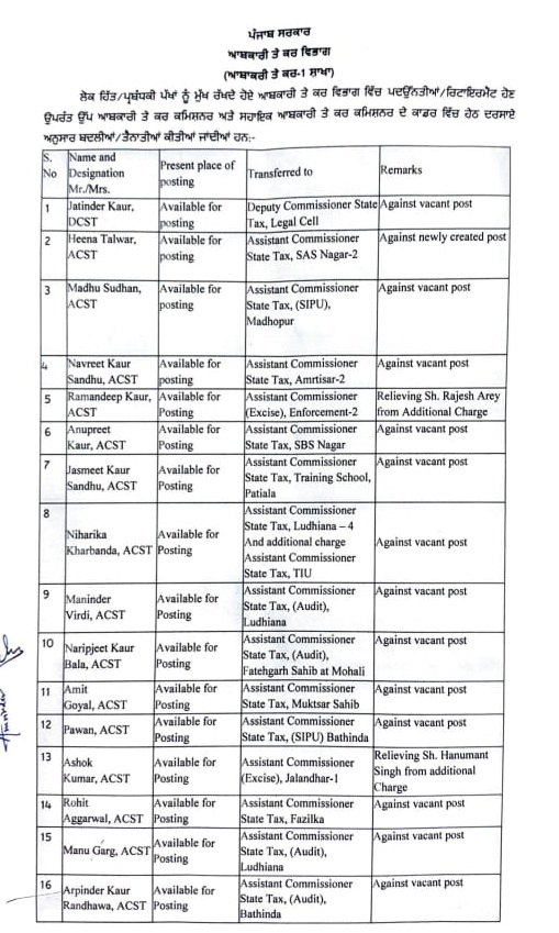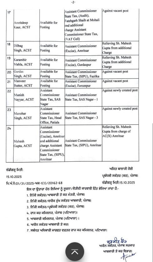 ਪੰਜਾਬ ਸਰਕਾਰ ਵੱਲੋਂ ਉਪ ਆਬਕਾਰੀ ਤੇ ਕਰ ਕਮਿਸ਼ਨਰ ਅਤੇ ਸਹਾਇਕ ਕਮਿਸ਼ਨਰਾਂ ਦੀਆਂ ਬਦਲੀਆਂ Punjab ਅਕਤੂਬਰ 15, 2025ਅਕਤੂਬਰ 15, 2025Leave a Comment on ਪੰਜਾਬ ਸਰਕਾਰ ਵੱਲੋਂ ਉਪ ਆਬਕਾਰੀ ਤੇ ਕਰ ਕਮਿਸ਼ਨਰ ਅਤੇ ਸਹਾਇਕ ਕਮਿਸ਼ਨਰਾਂ ਦੀਆਂ ਬਦਲੀਆਂ ਚੰਡੀਗੜ੍ਹ, 15 ਅਕਤੂਬਰ, ਦੇਸ਼ ਕਲਿੱਕ ਬਿਓਰੋ : ਪੰਜਾਬ ਸਰਕਾਰ ਵੱਲੋਂ ਆਬਕਾਰੀ ਤੇ ਕਰ ਵਿਭਾਗ ਵਿੱਚ ਲੋਕ ਹਿੱਤ/ਪ੍ਰਬੰਧਕੀ ਪੱਖਾਂ ਨੂੰ ਮੁੱਖ ਰੱਖਦੇ ਹੋਏ ਉਪ ਆਬਕਾਰੀ ਤੇ ਕਰ ਕਮਿਸ਼ਨਰ ਅਤੇ ਸਹਾਇਕ ਆਬਕਾਰੀ ਤੇ ਕਰ ਕਮਿਸ਼ਨਰ ਕਾਡਰ ਦੀਆਂ ਬਦਲੀਆਂ ਕੀਤੀਆਂ ਗਈਆਂ ਹਨ।