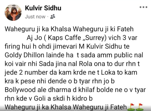 ਅੱਜ ਦੀ ਇਸ ਪੋਸਟ ‘ਚ ਕੁਲਵੀਰ ਸਿੱਧੂ ਨਾਮ ਦੇ ਇੱਕ ਫੇਸਬੁੱਕ ਅਕਾਊਂਟ ਤੋਂ ਇੱਕ ਪੋਸਟ ਵਿੱਚ ਲਿਖਿਆ ਗਿਆ ਹੈ ਕਿ, “ਵਾਹਿਗੁਰੂ ਜੀ ਕਾ ਖਾਲਸਾ, ਵਾਹਿਗੁਰੂ ਜੀ ਕੀ ਫਤਹਿ। ਮੈਂ, ਕੁਲਵੀਰ ਸਿੱਧੂ ਅਤੇ ਗੋਲਡੀ ਢਿੱਲੋਂ ਅੱਜ (ਕੈਪਸ ਕੈਫੇ, ਸਰੀ ਵਿਖੇ) ਹੋਈਆਂ ਤਿੰਨ ਗੋਲੀਕਾਂਡ ਦੀ ਜ਼ਿੰਮੇਵਾਰੀ ਲੈਂਦੇ ਹਾਂ। ਸਾਡੀ ਆਮ ਜਨਤਾ ਨਾਲ ਕੋਈ ਦੁਸ਼ਮਣੀ ਨਹੀਂ ਹੈ। ਜਿਨ੍ਹਾਂ ਨਾਲ ਸਾਡਾ ਕੋਈ ਝਗੜਾ ਨਹੀਂ ਹੈ, ਉਨ੍ਹਾਂ ਨੂੰ ਸਾਡੇ ਤੋਂ ਦੂਰ ਰਹਿਣਾ ਚਾਹੀਦਾ ਹੈ।”
