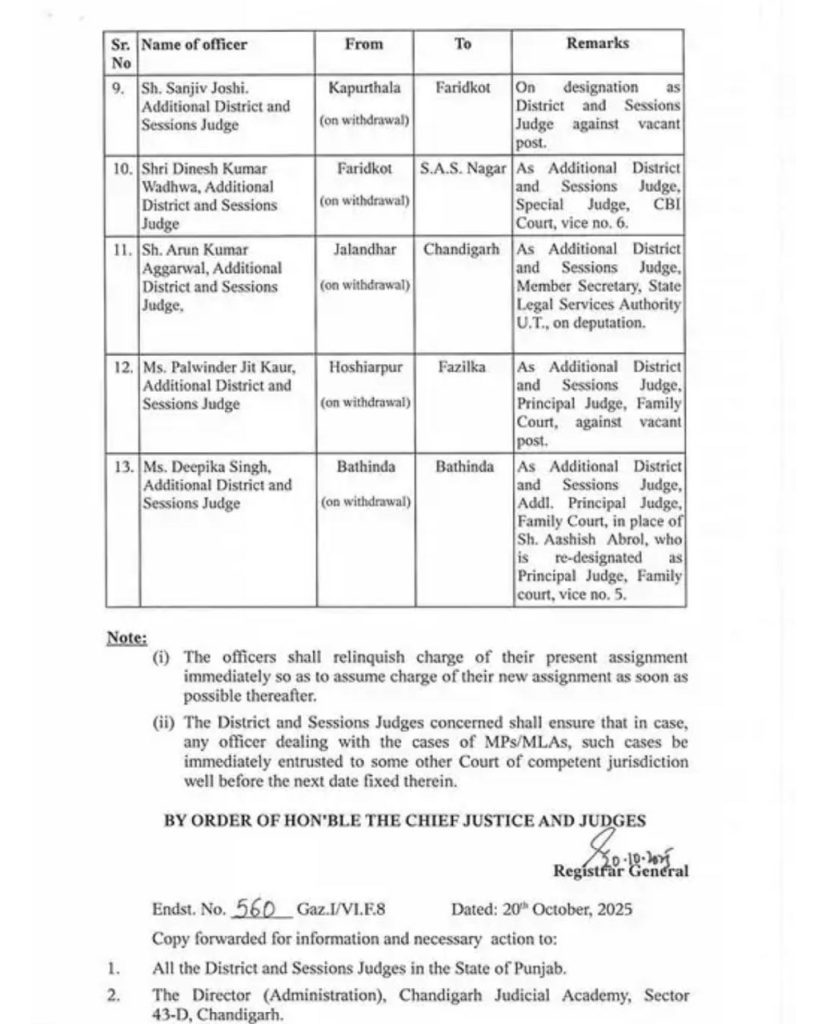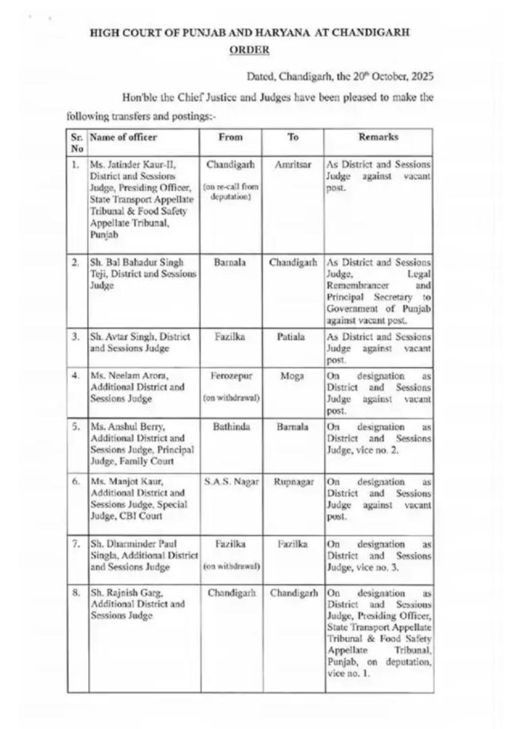 ਜਲਦੀ ਹੀ ਸਾਰੇ ਜੱਜ ਆਪਣੀਆਂ ਜ਼ਿੰਮੇਵਾਰੀਆਂ ਸੰਭਾਲਣਗੇ। ਜਤਿੰਦਰ ਕੌਰ ਨੂੰ ਅੰਮ੍ਰਿਤਸਰ ਦਾ ਜ਼ਿਲ੍ਹਾ ਅਤੇ ਸੈਸ਼ਨ ਜੱਜ ਨਿਯੁਕਤ ਕੀਤਾ ਗਿਆ ਹੈ। ਇਸ ਦੇ ਨਾਲ ਹੀ ਅਵਤਾਰ ਸਿੰਘ ਨੂੰ ਫਾਜ਼ਿਲਕਾ ਤੋਂ ਪਟਿਆਲਾ ਭੇਜਿਆ ਗਿਆ ਹੈ। ਇਸ ਦੇ ਨਾਲ ਹੀ ਹਰਿਆਣਾ ਵਿੱਚ 29 ਜੱਜਾਂ ਦਾ ਵੀ ਤਬਾਦਲਾ ਕੀਤਾ ਗਿਆ ਹੈ। ਜਿਕਰਯੋਗ ਹੈ ਕਿ ਇਸ ਤੋਂ ਪਹਿਲਾਂ 15 ਅਪ੍ਰੈਲ, 2025 ਨੂੰ ਪੰਜਾਬ ਦੇ 52 ਜ਼ਿਲ੍ਹਾ ਅਤੇ ਸੈਸ਼ਨ ਜੱਜਾਂ ਦਾ ਤਬਾਦਲਾ ਕੀਤਾ ਗਿਆ ਸੀ।