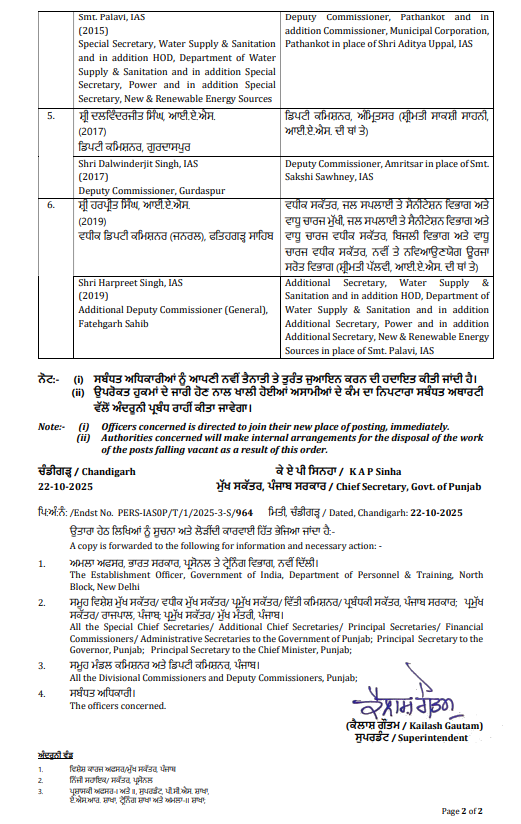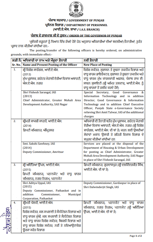 ਪੰਜਾਬ ਸਰਕਾਰ ਵੱਲੋਂ 6 IAS ਅਫਸਰਾਂ ਦੀਆਂ ਬਦਲੀਆਂ ਕੀਤੀਆਂ ਗਈਆਂ ਹਨ। ਪੂਰੀ ਸੂਚੀ ਹੇਠਾਂ ਦੇਖੋ…..