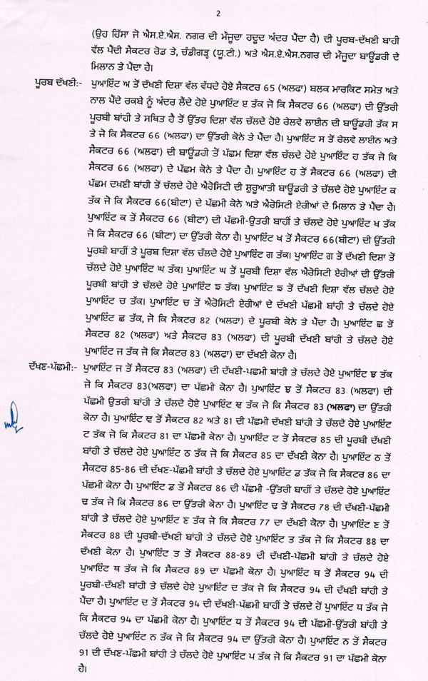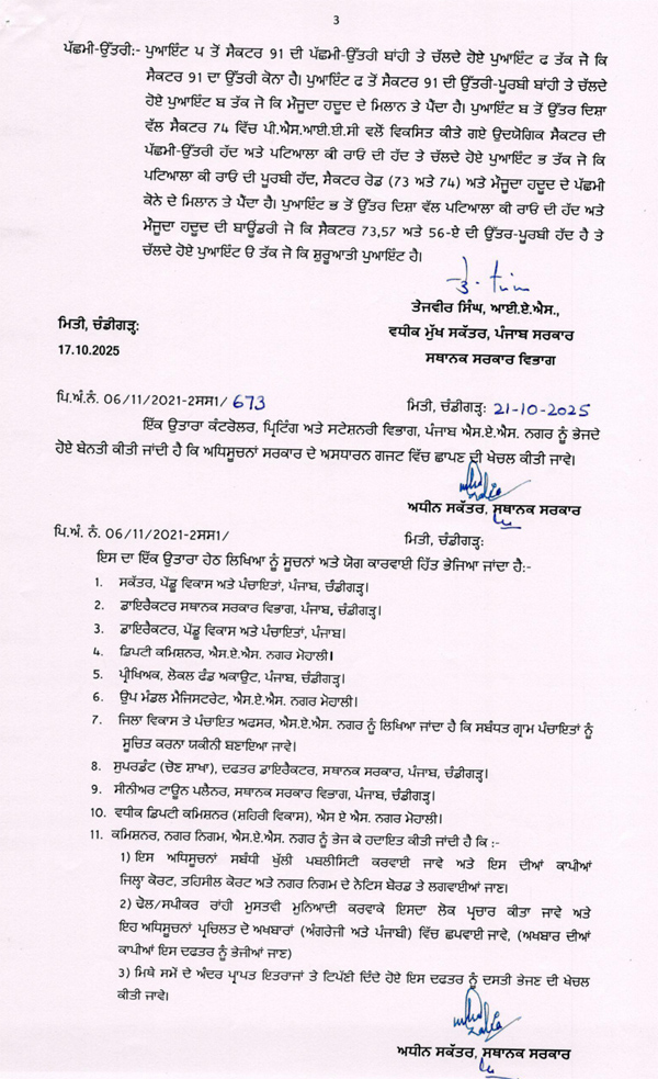 ਪੰਜਾਬ ਸਰਕਾਰ ਦੇ ਵਧੀਕ ਮੁੱਖ ਸਕੱਤਰ ਸਥਾਨਕ ਸਰਕਾਰਾਂ ਵਿਭਾਗ ਤੇਜਵੀਰ ਸਿੰਘ ਦੇ ਦਸਤਖਤਾਂ ਹੇਠ ਜਾਰੀ ਹੋਏ ਇਸ ਨੋਟੀਫਿਕੇਸ਼ਨ ’ਚ ਮੋਹਾਲੀ ਦਾ ਐਰੋਸਿਟੀ ਏਰੀਆ, ਸੈਕਟਰ 81-82, 83, 85, 86, ਸੈਕਟਰ 94 ਤੋਂ 91 ਤੱਕ, ਸੈਕਟਰ 73, 74 (ਉਦਯੋਗਿਕ ਏਰੀਆ) ਆਦਿ ਲਏ ਗਏ ਹਨ।