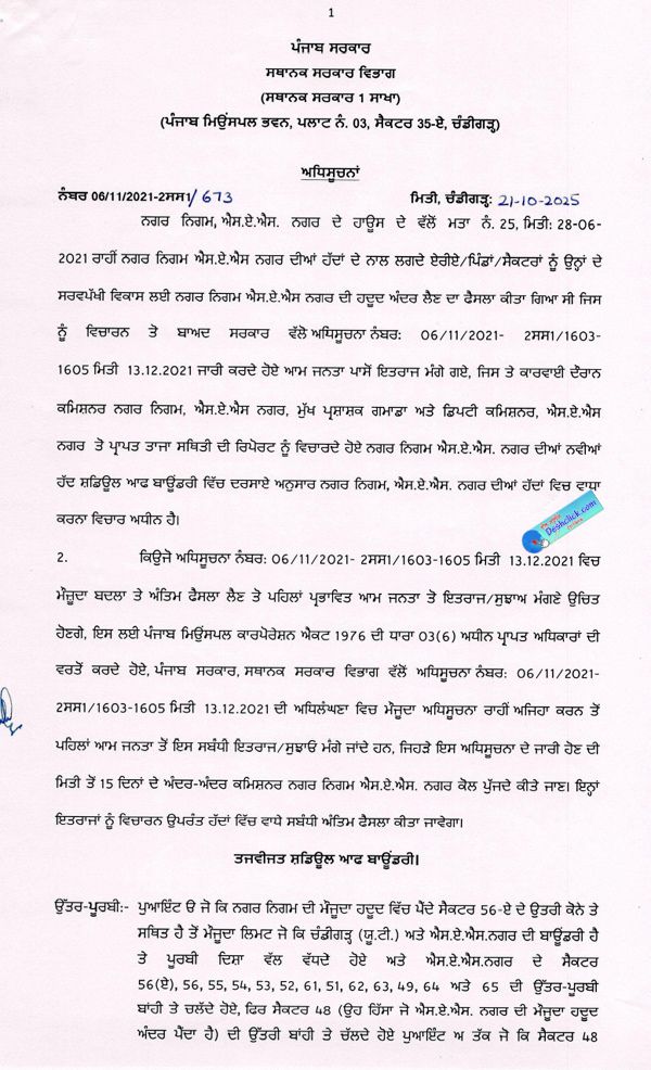 ਨਗਰ ਨਿਗਮ ਮੋਹਾਲੀ ਦੀਆਂ ਹੱਦਾਂ ਵਿੱਚ ਵਾਧਾ ਕਰਨ ਹਿੱਤ ਪੰਜਾਬ ਸਰਕਾਰ ਵੱਲੋਂ ਨੋਟੀਫਿਕੇਸ਼ਨ ਜਾਰੀ ਕੀਤਾ ਗਿਆ ਹੈ। ਸਰਕਾਰ ਵੱਲੋਂ 21 ਅਕਤੂਬਰ ਨੂੰ ਇਸ ਸਬੰਧੀ ਨੋਟੀਫਿਕੇਸ਼ਨ ਜਾਰੀ ਕੀਤਾ ਗਿਆ ਹੈ ਕਿ ਨਗਰ ਨਿਗਮ ਦੀਆਂ ਵਧਾਈਆਂ ਗਈਆਂ, ਹੱਦਾਂ ਬਾਰੇ 15 ਦਿਨਾ ਦੇ ਅੰਦਰ ਅੰਦਰ ਲੋਕਾਂ ਤੋਂ ਇਤਰਾਜ ਮੰਗੇ ਗਏ ਹਨ। ਇਸ ਤੋਂ ਬਾਅਦ ਕਾਰਪੋਰੇਸ਼ਨ ਦੀਆਂ ਹੱਦਾਂ ਵਧਾਉਣ ਬਾਰੇ ਨੋਟੀਫਿਕੇਸ਼ਨ ਜਾਰੀ ਕੀਤਾ ਜਾਵੇਗਾ।