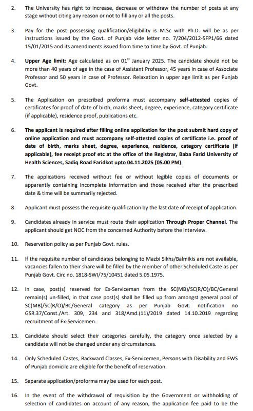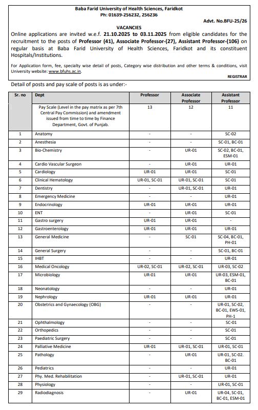 ਪੰਜਾਬ ਵਿੱਚ 106 ਪ੍ਰੋਫੈਸਰਾਂ ਦੀਆਂ ਅਸਾਮੀਆਂ ਨਿਕਲੀਆਂ ਹਨ। ਬਾਬਾ ਫਰੀਦ ਯੂਨੀਵਰਸਿਟੀ ਆਫ਼ ਹੈਲਥ ਸਾਇੰਸਿਜ਼, ਫਰੀਦਕੋਟ ਵਿੱਚ 106 ਪ੍ਰੋਫੈਸਰਾਂ ਦੀਆਂ ਅਸਾਮੀਆਂ ਲਈ ਅਰਜ਼ੀਆਂ ਦੀ ਮੰਗ ਕੀਤੀ ਗਈ ਹੈ। ਇਹ ਅਸਾਮੀਆਂ ਰੇਗੂਲਰ ਤੌਰ ਉਤੇ ਹੋਣਗੀਆਂ। ਯੋਗ ਉਮੀਦਵਾਰ 3 ਨਵੰਬਰ 2025 ਤੱਕ ਆਨਲਾਈਨ ਅਪਲਾਈ ਕਰ ਸਕਦੇ ਹਨ। posts of professors