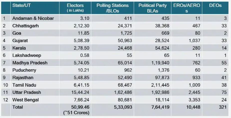 ਭਾਰਤ ਦੇ ਚੋਣ ਕਮਿਸ਼ਨ ਵੱਲੋਂ ਅੱਜ ਐਸ ਆਈ ਆਰ ਨੂੰ ਲੈ ਕੇ ਅਹਿਮ ਪ੍ਰੈਸ ਕਾਨਫਰੰਸ ਕੀਤੀ ਗਈ। ਚੋਣ ਕਮਿਸ਼ਨ ਵੱਲੋਂ ਕਿਹਾ ਗਿਆ ਕਿ ਬਿਹਾਰ ਵਿੱਚ ਐਸ ਆਈ ਆਰ ਦਾ ਪਹਿਲਾ ਪੜਾਅ ਸਫਲਤਾਪੂਰਕ ਪੂਰਾ ਹੋ ਚੁੱਕਿਆ ਹੈ। ਹੁਣ ਦੂਜਾ ਪੜਾਅ ਦੌਰਾਨ 12 ਸੂਬਿਆਂ ਅਤੇ ਕੇਂਦਰ ਸ਼ਾਸਤ ਪ੍ਰਦੇਸ਼ਾਂ ਵਿੱਚ ਸ਼ੁਰੂ ਹੋਵੇਗਾ। ਮੁੱਖ ਚੋਣ ਕਮਿਸ਼ਨ ਵੱਲੋਂ ਦੱਸਿਆ ਗਿਆ ਕਿ ਜਿੰਨਾਂ ਸੂਬਿਆਂ ਵਿੱਚ SIR ਹੋੇਗਾ, ਉਹ ਅੱਜ ਰਾਤ ਨੂੰ ਵੋਟਰ ਸੂਚੀ ਨੂੰ ਫਰੀਜ ਕਰ ਦਿੱਤਾ ਜਾਵੇਗਾ। 28 ਅਕਤੂਬਰ ਭਲਕੇ ਤੋਂ ਐਸਆਈਾਰ ਦਾ ਸ਼ਡਿਊਲ ਸ਼ੁਰੂ ਹੋਵੇਗਾ ਅਤੇ ਅਗਲੀ 7 ਫਰਵਰੀ ਤੱਕ ਚਲੇਗਾ।