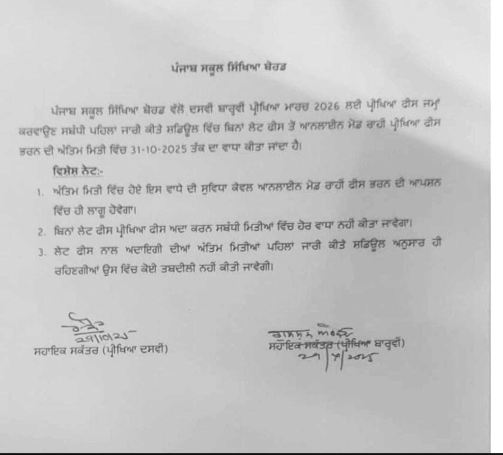 10ਵੀਂ ਅਤੇ 12ਵੀਂ ਕਲਾਸ ਦੀ ਪ੍ਰੀਖਿਆ ਫੀਸ ਜਮ੍ਹਾਂ ਕਰਾਉਣ ਲਈ ਮਿਤੀ ’ਚ ਵਾਧਾ ਪੰਜਾਬ ਅਕਤੂਬਰ 30, 2025ਅਕਤੂਬਰ 30, 2025Leave a Comment on 10ਵੀਂ ਅਤੇ 12ਵੀਂ ਕਲਾਸ ਦੀ ਪ੍ਰੀਖਿਆ ਫੀਸ ਜਮ੍ਹਾਂ ਕਰਾਉਣ ਲਈ ਮਿਤੀ ’ਚ ਵਾਧਾ ਮੋਹਾਲੀ, 30 ਅਕਤੂਬਰ, ਦੇਸ਼ ਕਲਿੱਕ ਬਿਓਰੋ : ਪੰਜਾਬ ਸਕੂਲ ਸਿੱਖਿਆ ਬੋਰਡ ਵੱਲੋਂ 10ਵੀਂ ਅਤੇ 12ਵੀਂ ਪ੍ਰੀਖਿਆ ਮਾਰਚ 2026 ਲਈ ਪ੍ਰੀਖਿਆ ਫੀਸ ਜਮ੍ਹਾਂ ਕਰਾਉਣ ਲਈ ਮਿਤੀ ਦਾ ਵਾਧਾ ਕੀਤਾ ਗਿਆ ਹੈ।