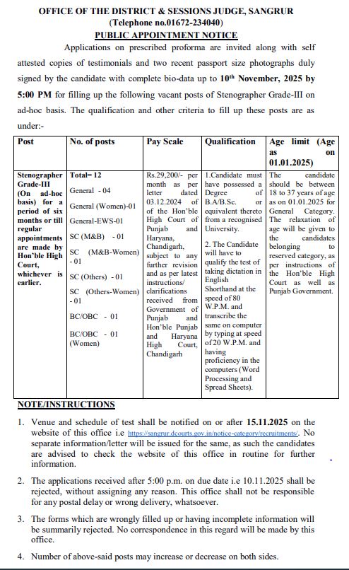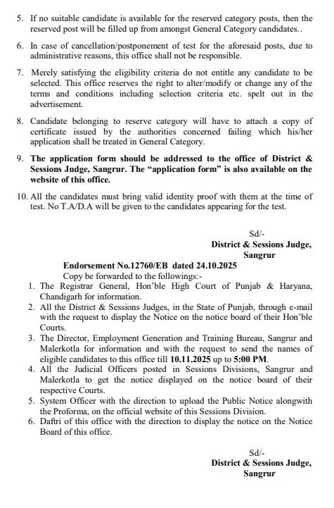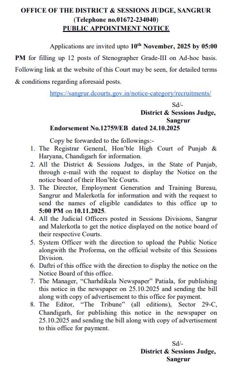 ਪੰਜਾਬ ਦੀ ਇਕ ਜ਼ਿਲ੍ਹਾ ਅਦਾਲਤ ’ਚ ਨਿਕਲੀਆਂ ਅਸਾਮੀਆਂ ਪੰਜਾਬ ਰੁਜ਼ਗਾਰ ਅਕਤੂਬਰ 30, 2025ਅਕਤੂਬਰ 30, 2025Leave a Comment on ਪੰਜਾਬ ਦੀ ਇਕ ਜ਼ਿਲ੍ਹਾ ਅਦਾਲਤ ’ਚ ਨਿਕਲੀਆਂ ਅਸਾਮੀਆਂ ਚੰਡੀਗੜ੍ਹ, ਦੇਸ਼ ਕਲਿੱਕ ਬਿਓਰੋ : ਪੰਜਾਬ ਦੀ ਇਕ ਜ਼ਿਲ੍ਹਾ ਅਦਾਲਤ ਵਿੱਚ ਅਸਾਮੀਆਂ ਨਿਕਲੀਆਂ ਹਨ। ਇਨ੍ਹਾਂ ਅਸਾਮੀਆਂ ਲਈ ਯੋਗ ਉਮੀਦਵਾਰਾਂ ਤੋਂ 10 ਨਵੰਬਰ ਤੱਕ ਅਰਜ਼ੀਆਂ ਮੰਗੀਆਂ ਗਈਆਂ ਹਨ। (govt job) ਜ਼ਿਲ੍ਹਾ ਅਦਾਲਤ ਸੰਗਰੂਰ ਵਿੱਚ 12 ਅਸਾਮੀਆਂ ਲਈ ਅਰਜ਼ੀਆਂ ਦੀ ਮੰਗ ਕੀਤੀ ਗਈ ਹੈ। ਪੰਜਾਬ ’ਚ ਨਿਕਲੀਆਂ ਪ੍ਰੋਫੈਸਰਾਂ ਦੀਆਂ ਅਸਾਮੀਆਂ PPSC ਨੇ ਕੱਢੀਆਂ ਅਸਾਮੀਆਂ