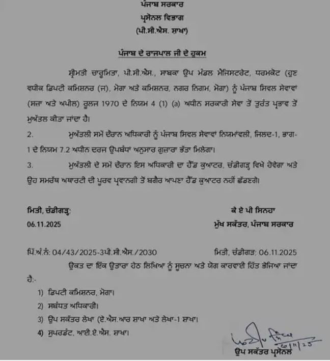 ਪੰਜਾਬ ਸਰਕਾਰ ਨੇ ਇਕ ਪੀਸੀਐਸ ਅਧਿਕਾਰੀ ਉਤੇ ਵੱਡੀ ਕਾਰਵਾਈ ਕਰਕੇ ਹੋਏ ਮੁਅੱਤਲ ਕੀਤਾ ਹੈ। ਸਰਕਾਰ ਨੇ ਮੋਗਾ ਦੀ ਏਡੀਸੀ ਅਤੇ ਨਗਰ ਨਿਗਮ ਕਮਿਸ਼ਨਰ ਚਾਰੂਮਿਤਾ ਨੂੰ ਮੁਅੱਤਲ ਕੀਤਾ ਗਿਆ ਹੈ। ਮੁੱਖ ਸਕੱਤਰ ਵੱਲੋਂ ਇਸ ਸਬੰਧੀ ਪੱਤਰ ਜਾਰੀ ਕੀਤਾ ਗਿਆ ਹੈ। ਸੂਤਰਾਂ ਤੋਂ ਮਿਲੀ ਜਾਣਕਾਰੀ ਅਨੁਸਾਰ ਧਰਮਕੋਟ ਤੋਂ ਬਹਾਦਰਵਾਲਾ ਤੋਂ ਨਿਕਲਣ ਵਾਲੇ ਨੈਸ਼ਨਲ ਹਾਈਵੇ ਲਈ ਜ਼ਮੀਨ ਅਕਵਾਇਰ ਕਰਨ ਮੌਕੇ ਮੁਅੱਵਜੇ ਵਿਚ ਗੜਬੜੀ ਕੀਤੀ ਗਈ ਸੀ। ਜਿਸ ਤੋਂ ਬਾਅਦ ਵਿਜੀਲੈਂਸ ਬਿਓਰੋ ਵੱਲੋਂ ਪੀਸੀਐਸ ਅਧਿਕਾਰੀ ਖਿਲਾਫ ਚਾਰਜਸੀਟ ਤਿਆਰ ਕੀਤੀ ਗਈ ਸੀ।