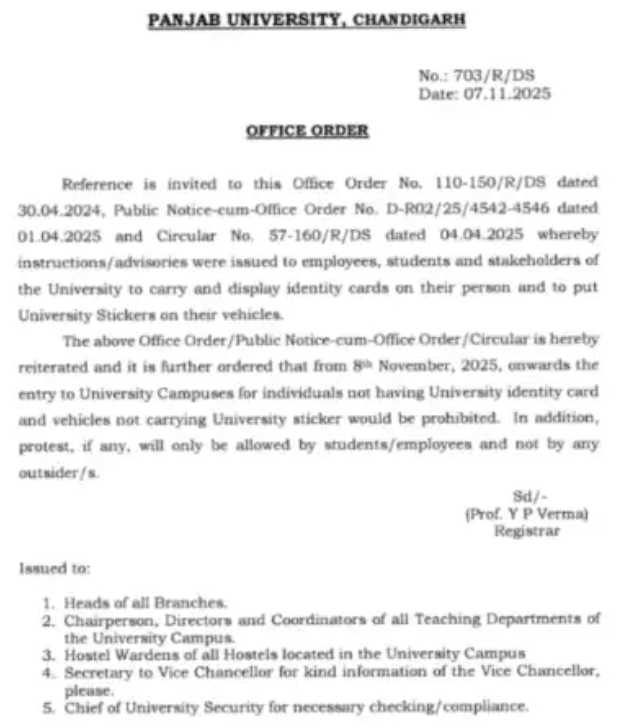 ਜਿਸ ਨੂੰ ਲੈ ਕੇ ਪੀਯੂ ਪ੍ਰਸ਼ਾਸਨ ਨੇ ਐਲਾਨ ਕੀਤਾ ਹੈ ਕਿ ਕੈਂਪਸ ਵਿੱਚ ਕਿਸੇ ਵੀ ਬਾਹਰੀ ਵਾਹਨ ਨੂੰ ਆਉਣ ਦੀ ਇਜਾਜ਼ਤ ਨਹੀਂ ਦਿੱਤੀ ਜਾਵੇਗੀ। ਸਰਕੂਲਰ ਕਿਹਾ ਗਿਆ ਹੈ ਕਿ ਸਿਰਫ ਵੈਧ ਯੂਨੀਵਰਸਿਟੀ ਸਟਿੱਕਰਾਂ ਵਾਲੇ ਵਾਹਨਾਂ ਦੀ ਹੀ ਆਗਿਆ ਹੋਵੇਗੀ। ਜਿਨ੍ਹਾਂ ਕੋਲ ਪਛਾਣ ਪੱਤਰ ਜਾਂ ਸਟਿੱਕਰ ਨਹੀਂ ਹੋਣਗੇ, ਉਨ੍ਹਾਂ ਨੂੰ ਕੈਂਪਸ ਵਿੱਚ ਆਉਣ ਦੀ ਇਜਾਜ਼ਤ ਨਹੀਂ ਦਿੱਤੀ ਜਾਵੇਗੀ। ਯੂਨੀਵਰਸਿਟੀ ਨੇ ਪਿਛਲੇ ਨੋਟਿਸਾਂ ਦਾ ਹਵਾਲਾ ਦਿੱਤਾ, ਜਿਨ੍ਹਾਂ ਵਿੱਚ ਅਪ੍ਰੈਲ 2025 ਦਾ ਇੱਕ ਨੋਟਿਸ ਵੀ ਸ਼ਾਮਲ ਹੈ, ਅਤੇ ਇਹ ਕੈਂਪਸ ਵਿੱਚ ਚੱਲ ਰਹੇ ਵਿਰੋਧ ਪ੍ਰਦਰਸ਼ਨਾਂ ਦੇ ਵਿਚਕਾਰ ਆਇਆ ਹੈ।