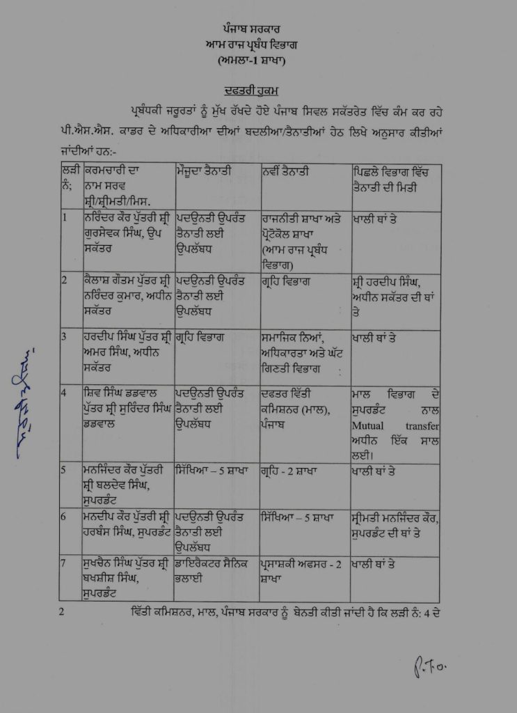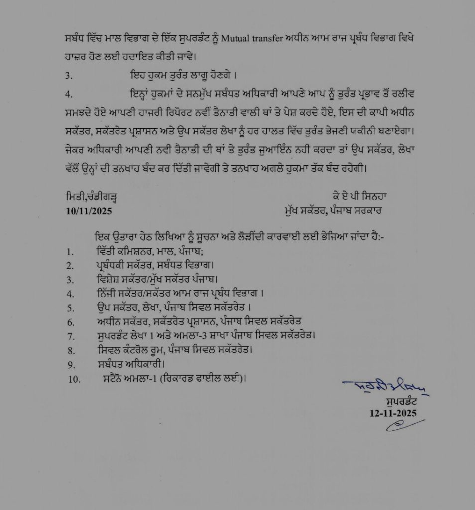 ਪੰਜਾਬ ਸਿਵਲ ਸਕੱਤਰੇਤ ‘ਚ 7 ਅਧਿਕਾਰੀਆਂ ਦੇ ਤਬਾਦਲੇ: ਪੜ੍ਹੋ ਸੂਚੀ ਪੰਜਾਬ ਨਵੰਬਰ 12, 2025ਨਵੰਬਰ 12, 2025Leave a Comment on ਪੰਜਾਬ ਸਿਵਲ ਸਕੱਤਰੇਤ ‘ਚ 7 ਅਧਿਕਾਰੀਆਂ ਦੇ ਤਬਾਦਲੇ: ਪੜ੍ਹੋ ਸੂਚੀ ਚੰਡੀਗੜ੍ਹ, 12 ਨਵੰਬਰ: ਦੇਸ਼ ਕਲਿੱਕ ਬਿਊਰੋ : ਪੰਜਾਬ ਸਰਕਾਰ ਨੇ ਸਿਵਲ ਸਕੱਤਰੇਤ ‘ਚ ਮੁਲਾਜ਼ਮ ਆਗੂ ਸੁਖਚੈਨ ਸਿੰਘ ਖਹਿਰਾ ਸਮੇਤ 7 ਅਧੀਨ ਸਕੱਤਰਾਂ ਸੁਪਰਡੈਂਟ ਪੱਧਰ ਦੇ ਅਧਿਕਾਰੀਆਂ ਦੇ ਤਬਾਦਲੇ ਕੀਤੇ ਗਏ ਹਨ। ਤਬਾਦਲਿਆਂ ਦੀ ਪੂਰੀ ਸੂਚੀ ਹੇਠਾਂ ਪੜ੍ਹੋ…….