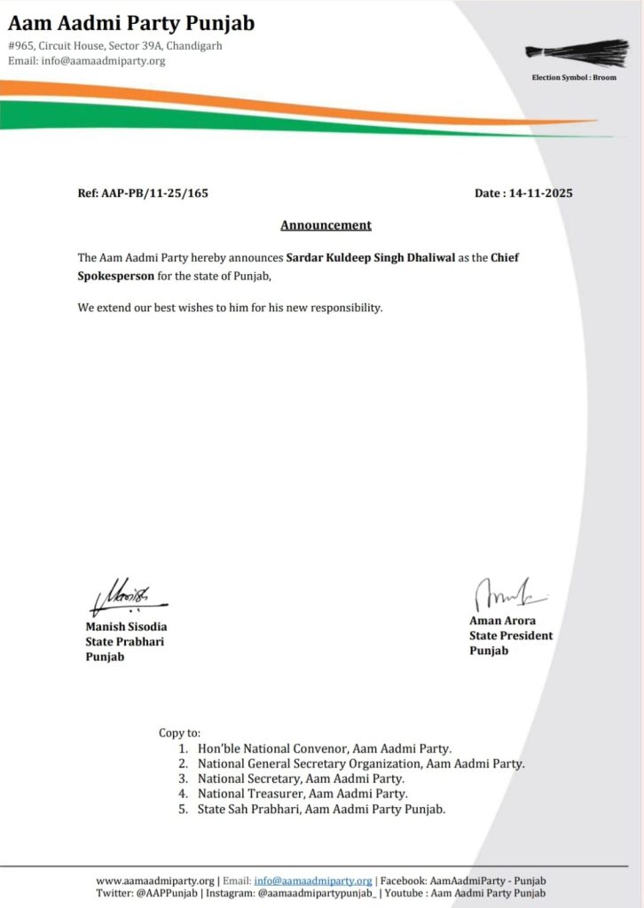 ਪਾਰਟੀ ਵੱਲੋਂ ਮੁੱਖ ਬੁਲਾਰਾ ਲਗਾਏ ਜਾਣ ਤੋਂ ਬਾਅਦ ਕੁਲਦੀਪ ਸਿੰਘ ਧਾਲੀਵਾਲ ਨੇ ਕਿਹਾ, ਵਿਕਾਸ ਦੀ ਰਾਜਨੀਤੀ ਕਰਨ ਵਾਲੀ ਮੇਰੀ ਪਾਰਟੀ ਨੇ ਮੈਨੂੰ ਪੰਜਾਬ ਦਾ ਮੁੱਖ ਬੁਲਾਰਾ ਨਿਯੁਕਤ ਕਰਕੇ ਲੋਕਾਂ ਤੱਕ ਪੰਜਾਬ ਦੇ ਹੱਕ ਦੀ ਗੱਲ ਪਹੁੰਚਾਉਣ ਦੀ ਜ਼ਿੰਮੇਵਾਰੀ ਦਿੱਤੀ, ਉਸ ਲਈ ਨੈਸ਼ਨਲ ਕਨਵੀਨਰ ਅਰਵਿੰਦ ਕੇਜਰੀਵਾਲ, ਮੁੱਖ ਮੰਤਰੀ ਭਗਵੰਤ ਮਾਨ, ਪੰਜਾਬ ਪ੍ਰਭਾਰੀ ਮਨੀਸ਼ ਸਿਸੋਦੀਆ ਅਤੇ ਪੰਜਾਬ ਪ੍ਰਧਾਨ ਅਮਨ ਅਰੋੜਾ ਦਾ ਬਹੁਤ-ਬਹੁਤ ਧੰਨਵਾਦ।