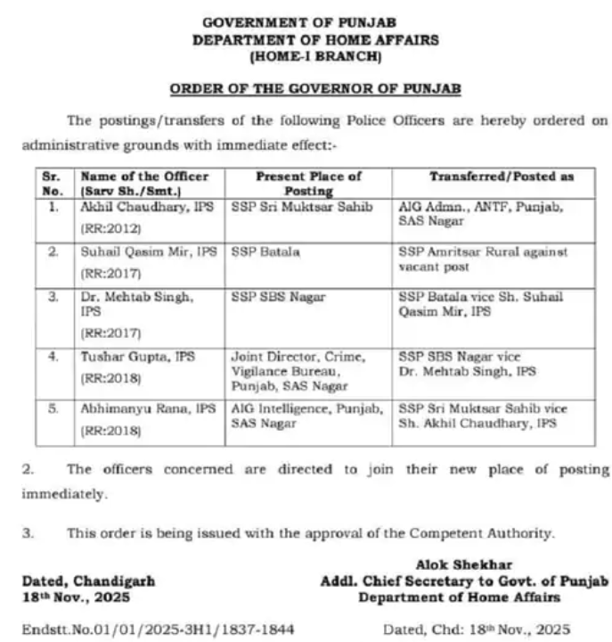 ਸਰਕਾਰੀ ਹੁਕਮਾਂ ਅਨੁਸਾਰ, ਬਟਾਲਾ ਦੇ ਐਸਐਸਪੀ ਸੁਹੇਲ ਕਾਸਿਮ ਮੀਰ ਹੁਣ ਅੰਮ੍ਰਿਤਸਰ ਦਿਹਾਤੀ ਦੇ ਐਸਐਸਪੀ ਹੋਣਗੇ।