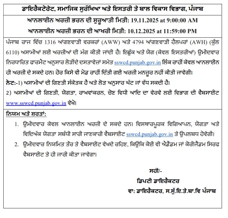 ਪੰਜਾਬ ਸਰਕਾਰ ਵੱਲੋਂ ਸੂਬੇ ਵਿੱਚ ਆਂਗਣਵਾੜੀ ਵਰਕਰਾਂ ਤੇ ਹੈਲਪਰਾਂ ਦੀਆਂ ਅਸਾਮੀਆਂ ਲਈ ਅਰਜ਼ੀਆਂ ਦੀ ਮੰਗ ਕੀਤੀ ਗਈ ਹੈ। ਯੋਗ ਉਮੀਦਵਾਰ 19 ਨਵੰਬਰ 2025 ਤੋਂ 10 ਦਸੰਬਰ 2025 ਤੱਕ ਆਨਲਾਈਨ ਅਪਲਾਈ ਕਰ ਸਕਦੀਆਂ ਹਨ।