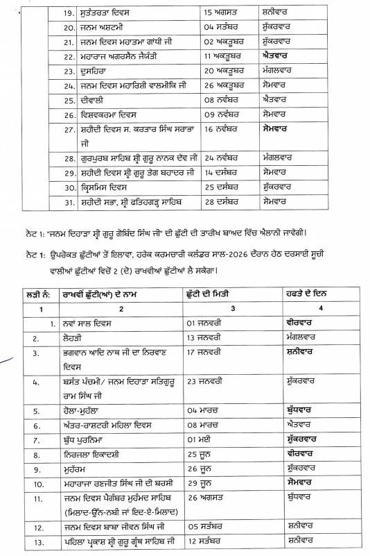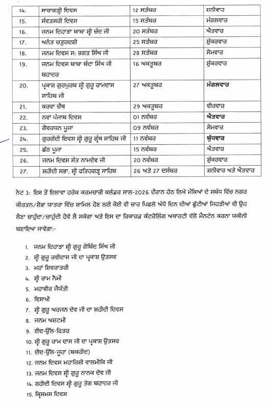 ਪੰਜਾਬ ਸਰਕਾਰ ਵੱਲੋਂ 2026 ਦੀਆਂ ਗਜ਼ਟਿਡ ਛੁੱਟੀਆਂ ਦਾ ਐਲਾਨ ਪੰਜਾਬ ਨਵੰਬਰ 26, 2025ਨਵੰਬਰ 26, 2025Leave a Comment on ਪੰਜਾਬ ਸਰਕਾਰ ਵੱਲੋਂ 2026 ਦੀਆਂ ਗਜ਼ਟਿਡ ਛੁੱਟੀਆਂ ਦਾ ਐਲਾਨ ਚੰਡੀਗੜ੍ਹ, 26 ਨਵੰਬਰ, ਦੇਸ਼ ਕਲਿੱਕ ਬਿਓਰੋ : ਪੰਜਾਬ ਸਰਕਾਰ ਵੱਲੋਂ ਕਲੰਡਰ ਸਾਲ 2026 ਦੌਰਾਨ ਪੰਜਾਬ ਸਰਕਾਰ ਦੀਆਂ ਅਨੁਸੂਚੀ ਵਾਲੀਆਂ ਗਜ਼ਟਿਡ ਛੁੱਟੀਆਂ ਦਾ ਐਲਾਨ ਕੀਤਾ ਗਿਆ ਹੈ।