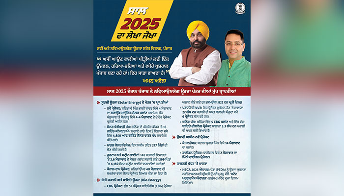 - ਅਮਨ ਅਰੋੜਾ ਨੇ ਸਾਲ 2025 ਦੌਰਾਨ ਨਵਿਆਉਣਯੋਗ ਊਰਜਾ ਖੇਤਰ ਵਿੱਚ ਪੰਜਾਬ ਦੀ ਬੇਮਿਸਾਲ ਪ੍ਰਗਤੀ ‘ਤੇ ਚਾਨਣਾ ਪਾਇਆ