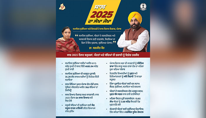 ਮੁੱਖ ਮੰਤਰੀ ਭਗਵੰਤ ਸਿੰਘ ਮਾਨ ਦੀ ਅਗਵਾਈ ਹੇਠ ਪੰਜਾਬ ਸਰਕਾਰ ਵੱਲੋਂ ਸਮਾਜ ਦੇ ਹਰ ਵਰਗ ਦੀ ਭਲਾਈ ਲਈ ਨਿਰੰਤਰ ਲੋਕ-ਪੱਖੀ ਨੀਤੀਆਂ ਲਾਗੂ ਕੀਤੀਆਂ ਜਾ ਰਹੀਆਂ ਹਨ। ਬਜ਼ੁਰਗਾਂ, ਔਰਤਾਂ, ਬੱਚਿਆਂ ਅਤੇ ਦਿਵਿਆਂਗਜਨਾਂ ਦੀ ਸਮਾਜਿਕ ਅਤੇ ਆਰਥਿਕ ਸੁਰੱਖਿਆ ਨੂੰ ਯਕੀਨੀ ਬਣਾਉਣ ਲਈ ਸਾਲ 2025 (ਵਿੱਤੀ ਸਾਲ 2025-26) ਦੌਰਾਨ ਕਈ ਇਤਿਹਾਸਕ ਪਹਿਲਕਦਮੀਆਂ ਕੀਤੀਆਂ ਗਈਆਂ ਹਨ। ਇਹ ਪ੍ਰਗਟਾਵਾ ਸਮਾਜਿਕ ਸੁਰੱਖਿਆ, ਇਸਤਰੀ ਅਤੇ ਬਾਲ ਵਿਕਾਸ ਮੰਤਰੀ ਡਾ. ਬਲਜੀਤ ਕੌਰ ਨੇ ਕੀਤਾ।