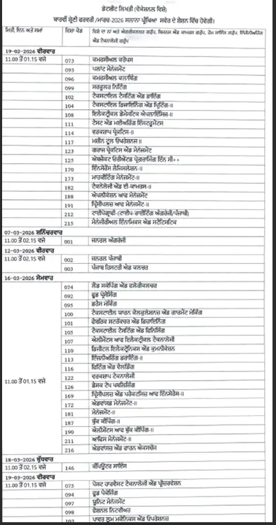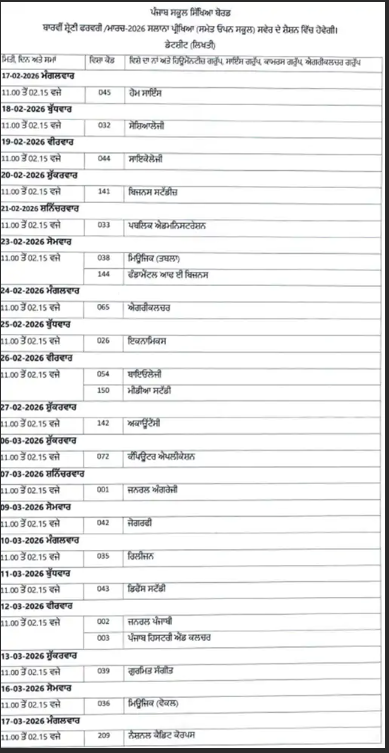 ਪੰਜਾਬ ਸਕੂਲ ਸਿੱਖਿਆ ਬੋਰਡ (PSEB) ਨੇ 8ਵੀਂ, 10ਵੀਂ ਅਤੇ 12ਵੀਂ ਜਮਾਤ ਦੀਆਂ ਲਿਖਤੀ ਪ੍ਰੀਖਿਆਵਾਂ ਦੀ ਡੇਟਸ਼ੀਟ ਜਾਰੀ ਕਰ ਦਿੱਤੀ ਹੈ। ਡੇਟਸ਼ੀਟ ਅਨੁਸਾਰ, 8ਵੀਂ ਜਮਾਤ ਦੀਆਂ ਪ੍ਰੀਖਿਆਵਾਂ 17 ਫਰਵਰੀ ਨੂੰ ਸ਼ੁਰੂ ਹੋਣਗੀਆਂ ਅਤੇ 27 ਫਰਵਰੀ ਤੱਕ ਚੱਲਣਗੀਆਂ। 10ਵੀਂ ਜਮਾਤ ਦੀਆਂ ਬੋਰਡ ਪ੍ਰੀਖਿਆਵਾਂ 6 ਮਾਰਚ ਨੂੰ ਸ਼ੁਰੂ ਹੋਣਗੀਆਂ ਅਤੇ 1 ਅਪ੍ਰੈਲ ਨੂੰ ਸਮਾਪਤ ਹੋਣਗੀਆਂ। ਇਸ ਤੋਂ ਇਲਾਵਾ, 12ਵੀਂ ਜਮਾਤ ਦੀਆਂ ਪ੍ਰੀਖਿਆਵਾਂ 17 ਫਰਵਰੀ ਨੂੰ ਸ਼ੁਰੂ ਹੋਣਗੀਆਂ ਅਤੇ 4 ਅਪ੍ਰੈਲ ਨੂੰ ਸਮਾਪਤ ਹੋਣਗੀਆਂ।