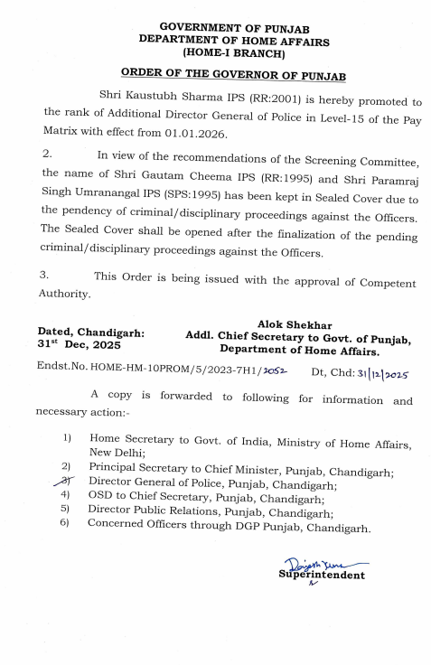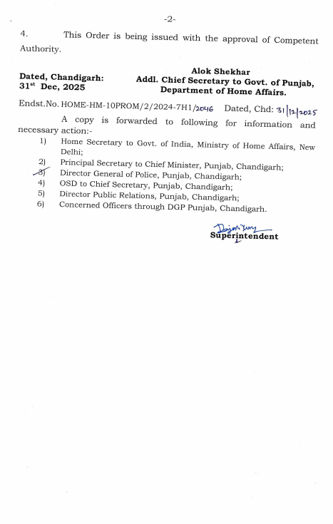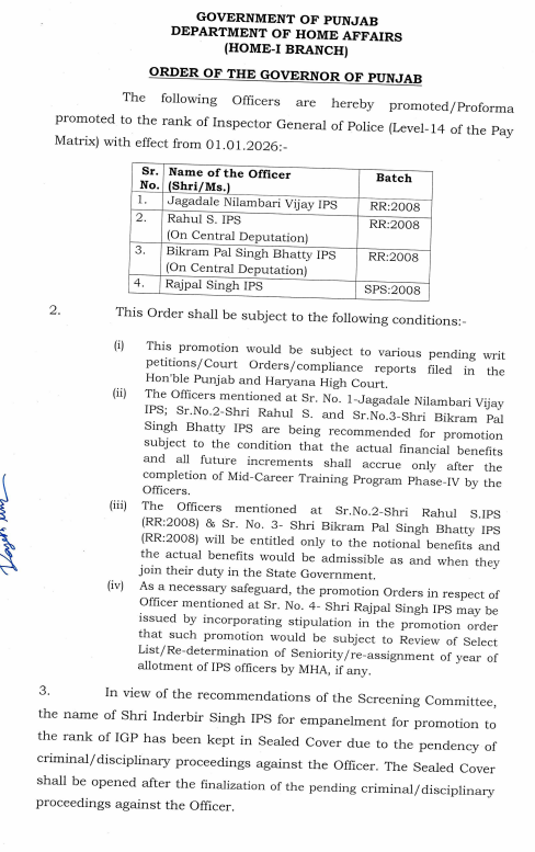 IPS ਅਫ਼ਸਰਾਂ ਦੀਆਂ ਤਰੱਕੀਆਂ ਪੰਜਾਬ ਜਨਵਰੀ 2, 2026ਜਨਵਰੀ 2, 2026Leave a Comment on IPS ਅਫ਼ਸਰਾਂ ਦੀਆਂ ਤਰੱਕੀਆਂ ਚੰਡੀਗੜ੍ਹ, 2 ਜਨਵਰੀ: ਦੇਸ਼ ਕਲਿੱਕ ਬਿਊਰੋ: ਪੰਜਾਬ ਸਰਕਾਰ ਵੱਲੋਂ ਆਈ ਪੀ ਐਸ ਅਫ਼ਸਰਾਂ ਨੂੰ ਪ੍ਰਮੋਟ ਕੀਤਾ ਗਿਆ ਹੈ। ਇਹ ਤਰੱਕੀਆਂ 1 ਜਨਵਰੀ, 2026 ਤੋਂ ਪ੍ਰਭਾਵੀ ਮੰਨੀਆ ਜਾਣਗੀਆਂ। ਦੇਖੋ ਲਿਸਟ…