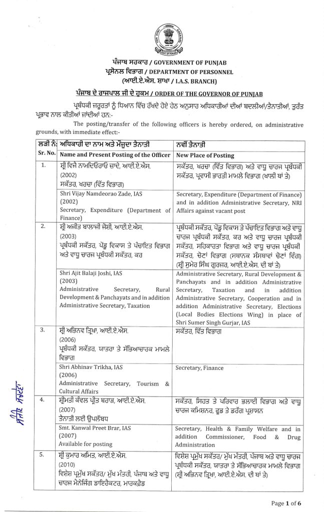 26 IAS/PCS ਅਫਸਰਾਂ ਦਾ ਤਬਾਦਲਾ ਪੰਜਾਬ ਜਨਵਰੀ 21, 2026ਜਨਵਰੀ 21, 2026Leave a Comment on 26 IAS/PCS ਅਫਸਰਾਂ ਦਾ ਤਬਾਦਲਾ ਚੰਡੀਗੜ੍ਹ, 21 ਜਨਵਰੀ: ਦੇਸ਼ ਕਲਿੱਕ ਬਿਊਰੋ: ਪੰਜਾਬ ਸਰਕਾਰ ਵੱਲੋਂ 26 IAS/PCS ਅਫਸਰਾਂ ਦਾ ਤਬਾਦਲਾ ਕੀਤਾ ਗਿਆ ਹੈ। ਜਿਸ ‘ਚ 20 IAS ਅਤੇ 6 PCS ਅਫਸਰ ਸ਼ਾਮਿਲ ਹਨ। ਇਹ ਤਬਾਦਲੇ ਤੁਰੰਤ ਪ੍ਰਭਾਵ ਨਾਲ ਲਾਗੂ ਕੀਤੇ ਗਏ ਹਨ। ਪੂਰੀ ਸੂਚੀ ਹੇਠਾਂ ਦੇਖੋ…….