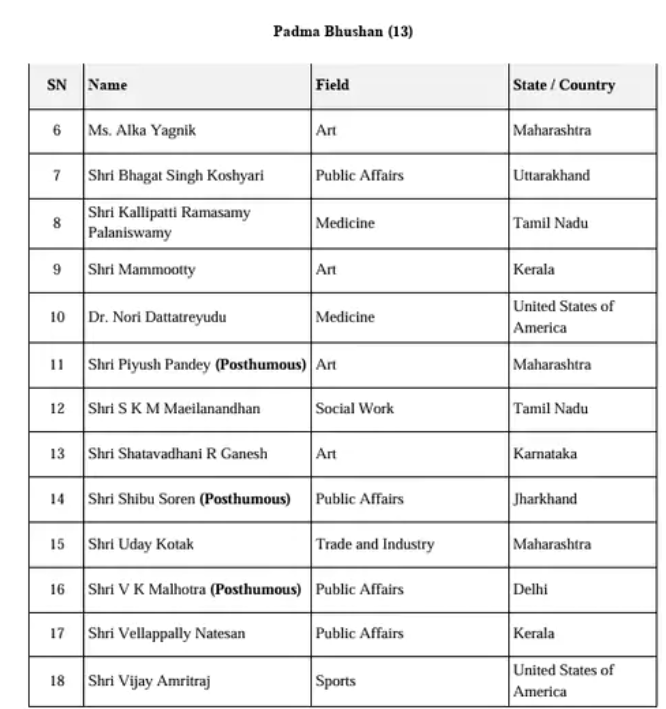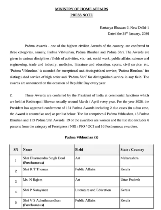 ਐਤਵਾਰ, ਗਣਤੰਤਰ ਦਿਵਸ ਦੀ ਪੂਰਵ ਸੰਧਿਆ ‘ਤੇ, ਕੇਂਦਰ ਸਰਕਾਰ ਨੇ 2026 ਲਈ 131 ਪਦਮ ਪੁਰਸਕਾਰਾਂ ਦਾ ਐਲਾਨ ਕੀਤਾ। ਮਰਹੂਮ ਅਦਾਕਾਰ ਧਰਮਿੰਦਰ ਸਮੇਤ ਪੰਜ ਵਿਅਕਤੀਆਂ ਨੂੰ ਪਦਮ ਵਿਭੂਸ਼ਣ ਨਾਲ ਸਨਮਾਨਿਤ ਕੀਤਾ ਜਾਵੇਗਾ। ਝਾਰਖੰਡ ਦੇ ਸਾਬਕਾ ਮੁੱਖ ਮੰਤਰੀ ਸ਼ਿਬੂ ਸੋਰੇਨ ਅਤੇ ਬਾਲੀਵੁੱਡ ਗਾਇਕਾ ਅਲਕਾ ਯਾਗਨਿਕ ਸਮੇਤ ਤੇਰਾਂ ਵਿਅਕਤੀਆਂ ਨੂੰ ਪਦਮ ਭੂਸ਼ਣ ਨਾਲ ਸਨਮਾਨਿਤ ਕੀਤਾ ਜਾਵੇਗਾ।