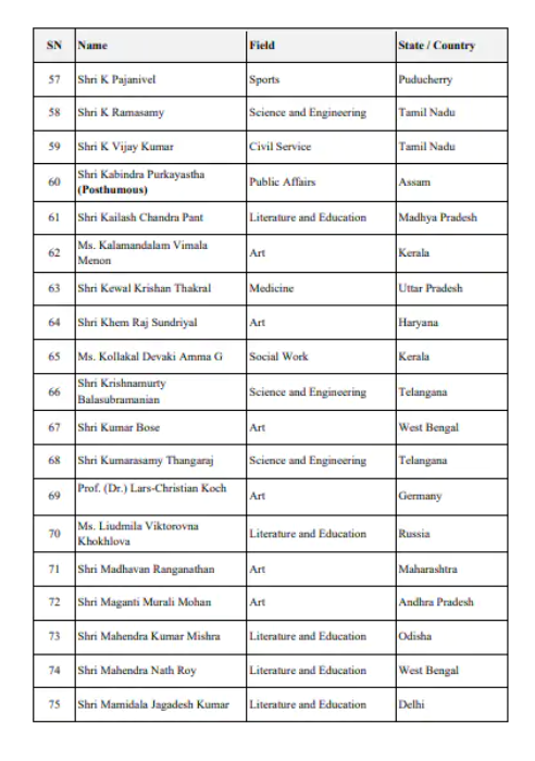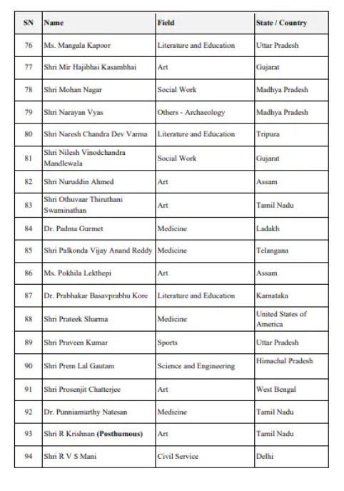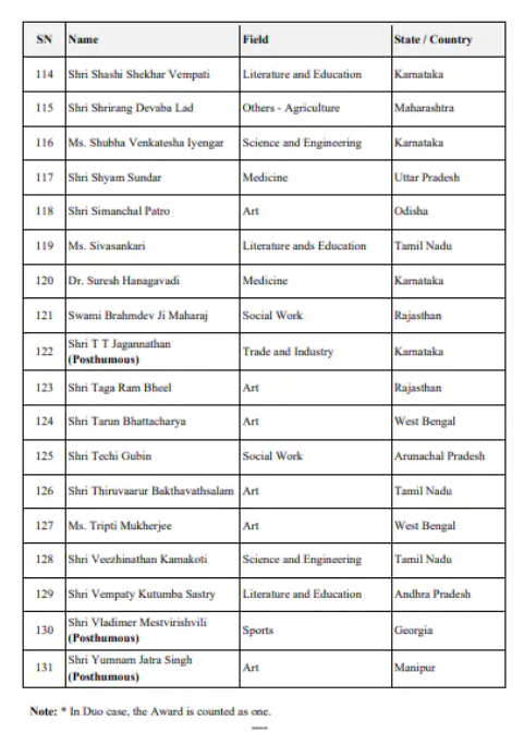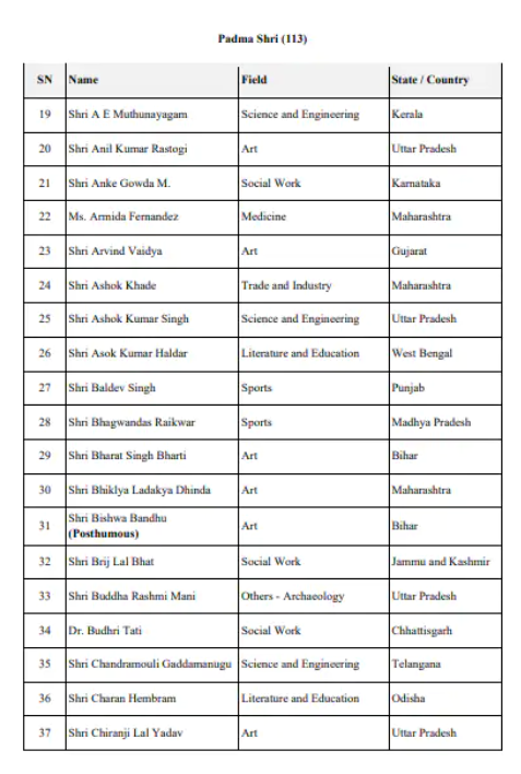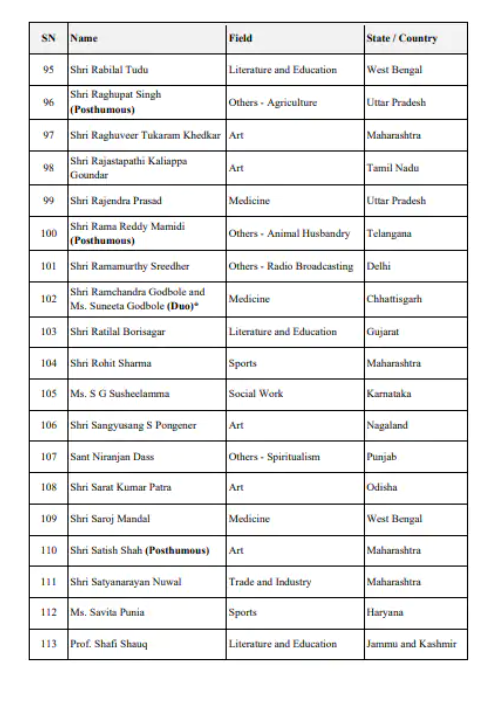ਕ੍ਰਿਕਟਰ ਰੋਹਿਤ ਸ਼ਰਮਾ, ਪੈਰਾ-ਐਥਲੀਟ ਪ੍ਰਵੀਨ ਕੁਮਾਰ, ਮਹਿਲਾ ਕ੍ਰਿਕਟ ਟੀਮ ਦੀ ਕਪਤਾਨ ਹਰਮਨਪ੍ਰੀਤ ਕੌਰ ਅਤੇ ਹਾਕੀ ਖਿਡਾਰੀ ਸਵਿਤਾ ਪੂਨੀਆ ਸਮੇਤ 113 ਵਿਅਕਤੀਆਂ ਨੂੰ ਪਦਮ ਸ਼੍ਰੀ ਲਈ ਚੁਣਿਆ ਗਿਆ ਹੈ।