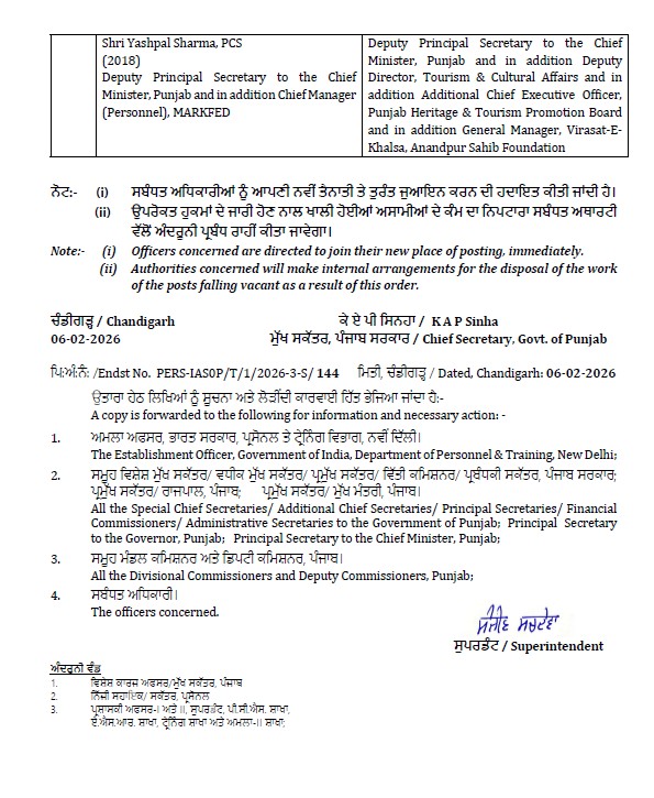 ਪੰਜਾਬ ‘ਚ 4 IAS/PCS ਅਫ਼ਸਰਾਂ ਦੇ ਤਬਾਦਲੇ ਕੀਤੇ ਗਏ ਹਨ। ਇਨ੍ਹਾਂ ਵਿਚ 2 IAS ਤੇ 2 PCS ਅਫ਼ਸਰ ਸ਼ਾਮਲ ਹਨ। ਇਸ ਸਬੰਧੀ ਜਾਰੀ ਹੁਕਮਾਂ ਮੁਤਾਬਕ IAS ਅਫ਼ਸਰ ਰਾਮਵੀਰ ਤੋਂ ਪੰਜਾਬ ਮੰਡੀ ਬੋਰਡ ਦੇ ਸਕੱਤਰ ਦਾ ਵਾਧੂ ਚਾਰਜ ਲੈ ਕੇ ਕੁਮਾਰ ਅਮਿਤ ਨੂੰ ਦੇ ਦਿੱਤਾ ਗਿਆ ਹੈ। ਪੜ੍ਹੋ ਪੂਰੀ ਲਿਸਟ……