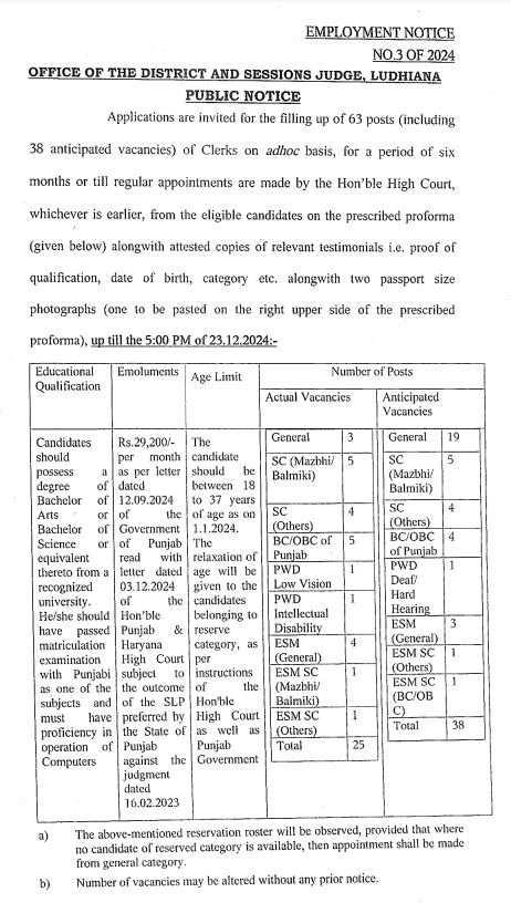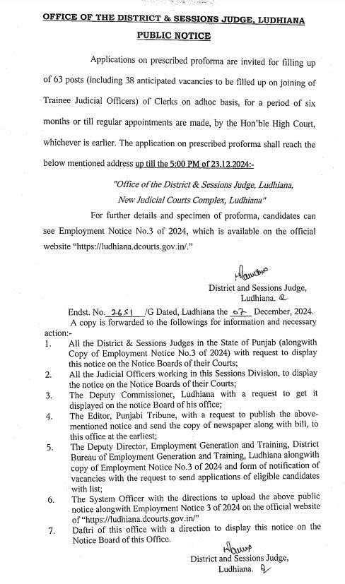 ਸਰਕਾਰੀ ਨੌਕਰੀ ਦੀ ਉਡੀਕ ਕਰ ਰਹੇ ਨੌਜਵਾਨਾਂ ਲਈ ਇਕ ਚੰਗੀ ਖਬਰ ਹੈ ਕਿ ਜ਼ਿਲ੍ਹਾ ਅਦਾਲਤ ਲੁਧਿਆਣਾ ਵਿੱਚ ਅਸਾਮੀਆਂ ਨਿਕਲੀਆਂ ਹਨ। ਇਨ੍ਹਾਂ ਅਸਾਮੀਆਂ ਲਈ ਯੋਗ ਉਮੀਦਵਾਰ 23 ਦਸੰਬਰ 2024 ਤੱਕ ਅਪਲਾਈ ਕਰ ਸਕਦੇ ਹਨ। ਜ਼ਿਲ੍ਹਾ ਅਦਾਲਤ ਵੱਲੋਂ 63 ਅਸਾਮੀਆਂ ਲਈ ਅਰਜ਼ੀਆਂ ਦੀ ਮੰਗ ਕੀਤੀ ਗਈ ਹੈ।